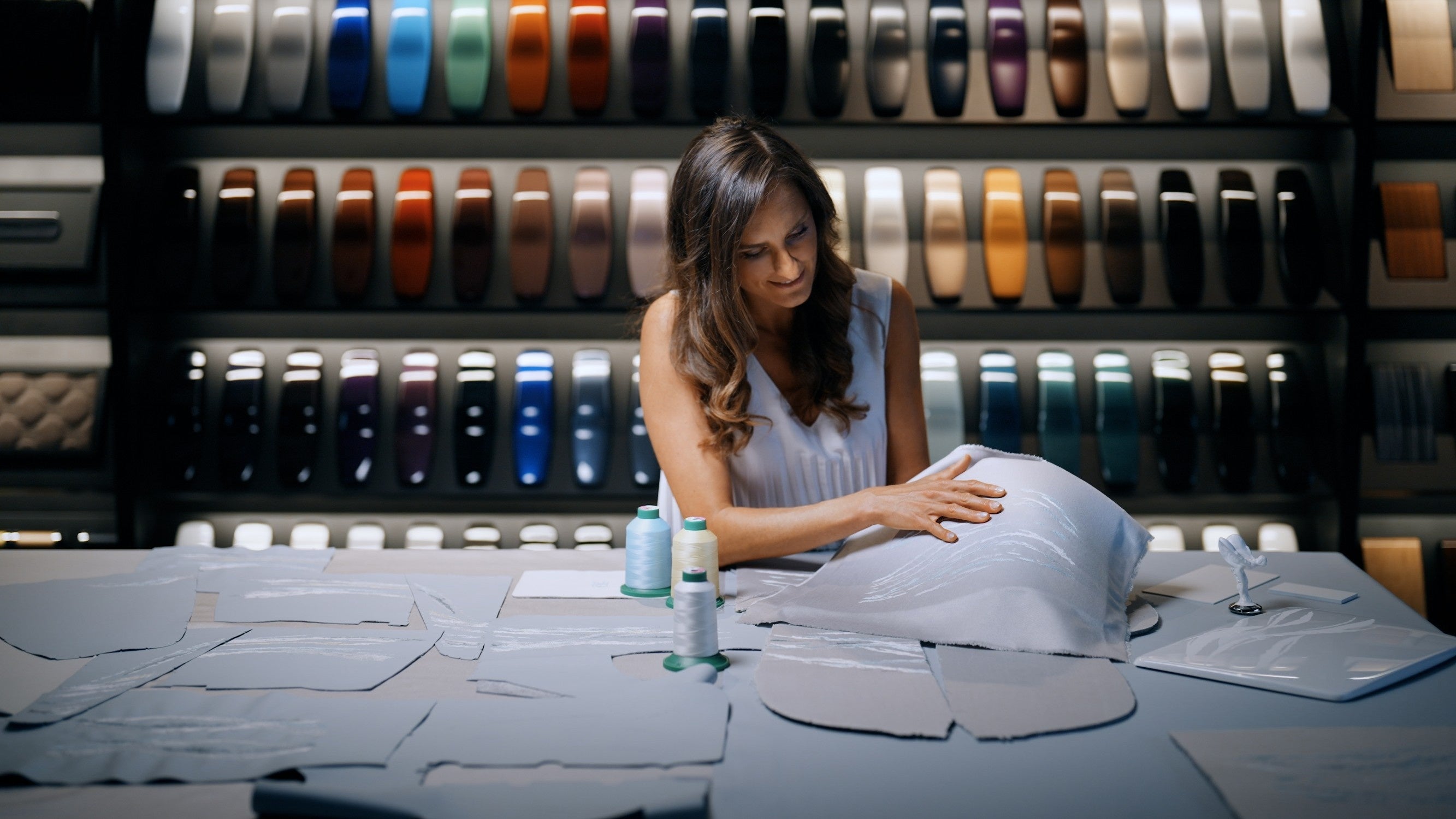「このデザインを立体的に表現することは素晴らしい創造的挑戦でした。刺繍のディテールや質感、触感を適切なレベルにまで高めるために、ビスポークのデザイン・チームと2年半以上にわたって緊密に協力し合う必要がありました。レザーとファブリックという2つのキャンバスは、刺繍を施すとそれぞれ異なる表情を見せるため、さらに複雑さが増しました。別々に刺繍を施した36種類のパネルを慎重にぴったりと合わせて配置することで、インテリア・スイート全体にシームレスで流れるようなモチーフをつくり出しました。」