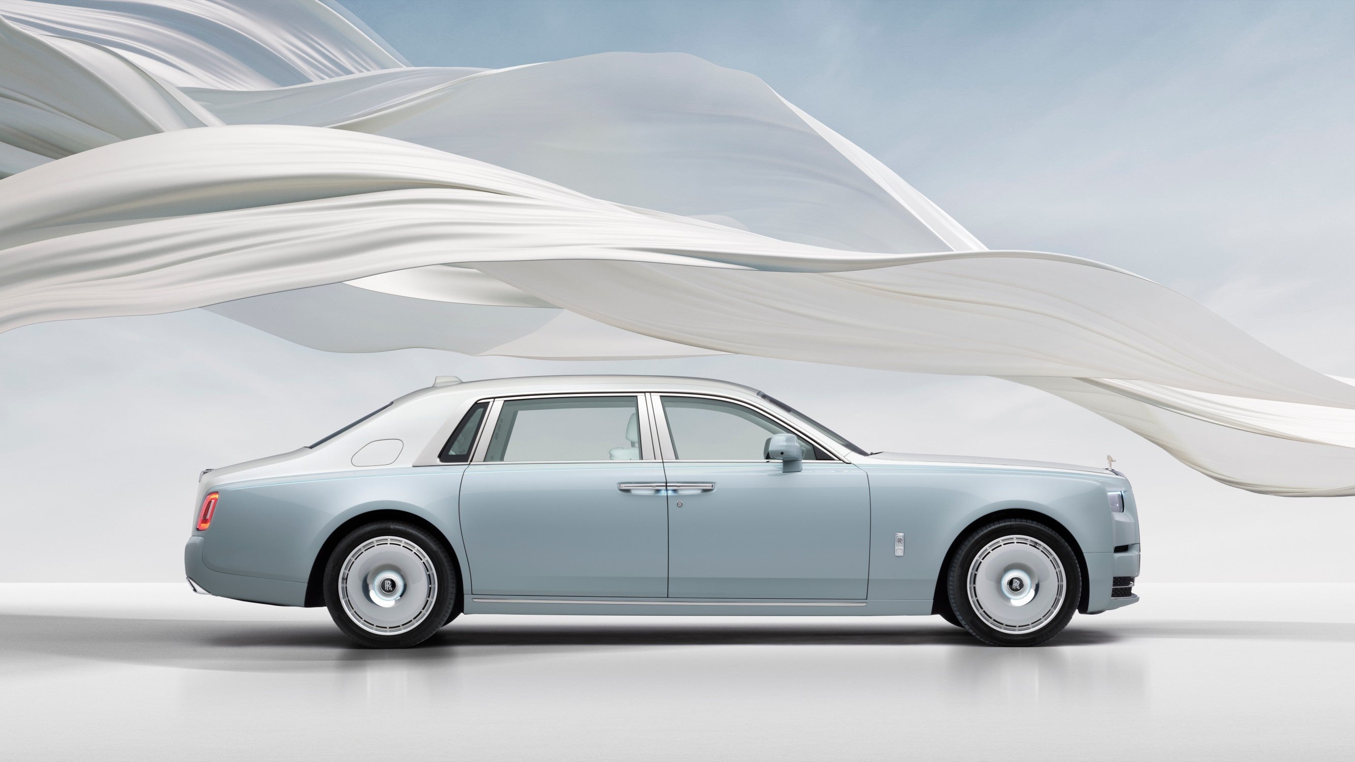 ファントム・シンティラのエクステリアはビスポークのツートーン仕上げで、ボディ上部にはアンダルシアン・ホワイト、ボディ下部には「サモトラケのニケ」の由来となったサモトラケ島を囲む海の色から着想を得たトラキアン・ブルーが配されています。繊細なメタリックフレークが海面を照らす太陽光の輝きを模しています。手塗りのダブルコーチラインとスピリット・ブルーのホイール・ピンストライプが、優雅なエクステリアを完成させています。