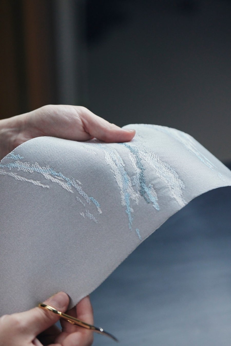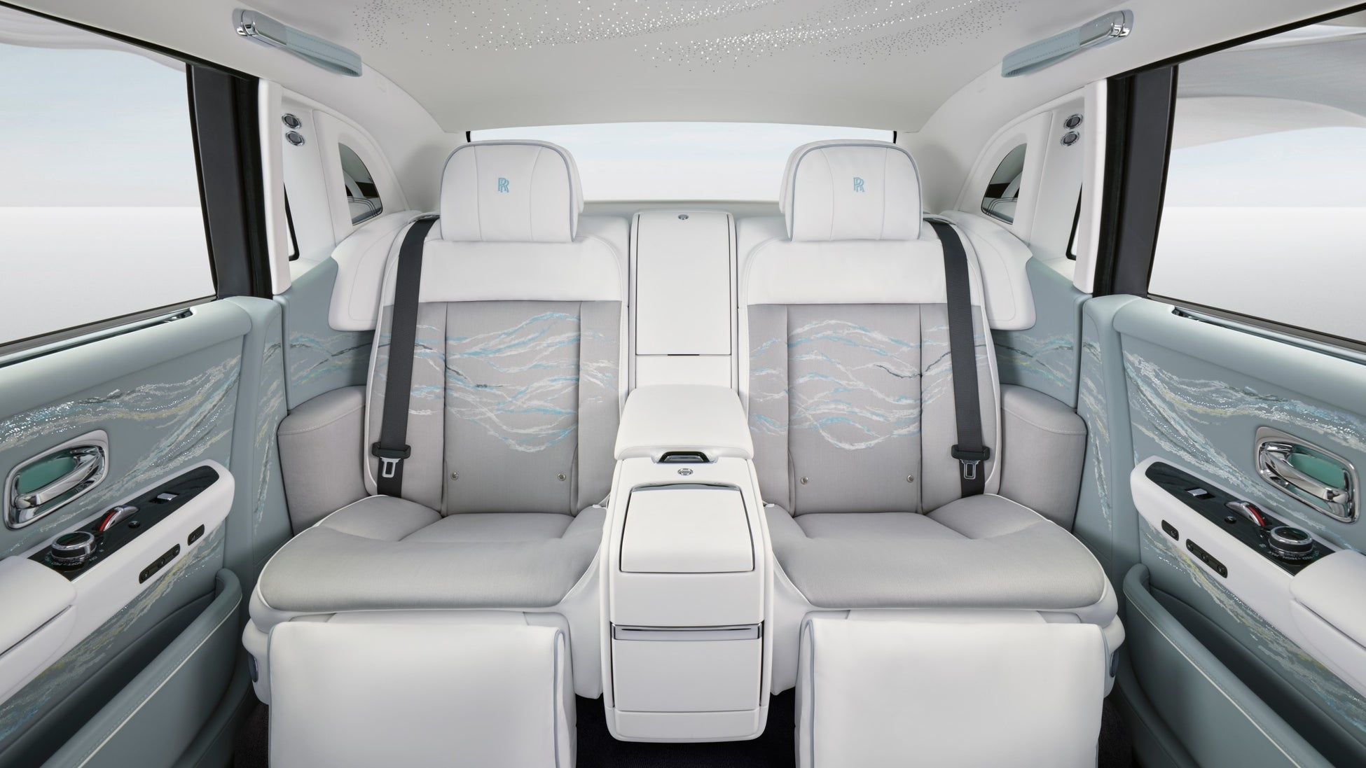 「私たちは水彩画のように見える単一のグラフィックを作り上げようと考え、これを『糸による絵画」と呼んでいます。光沢を与えるために4つの異なる色、糸の太さ、さまざまな方向のステッチを織り交ぜました。これにより、ロールス・ロイスではこれまでに探求したことのない領域をカバーし、これまでのロールス・ロイス車で最も密度の高い刺繍を実現しました。」