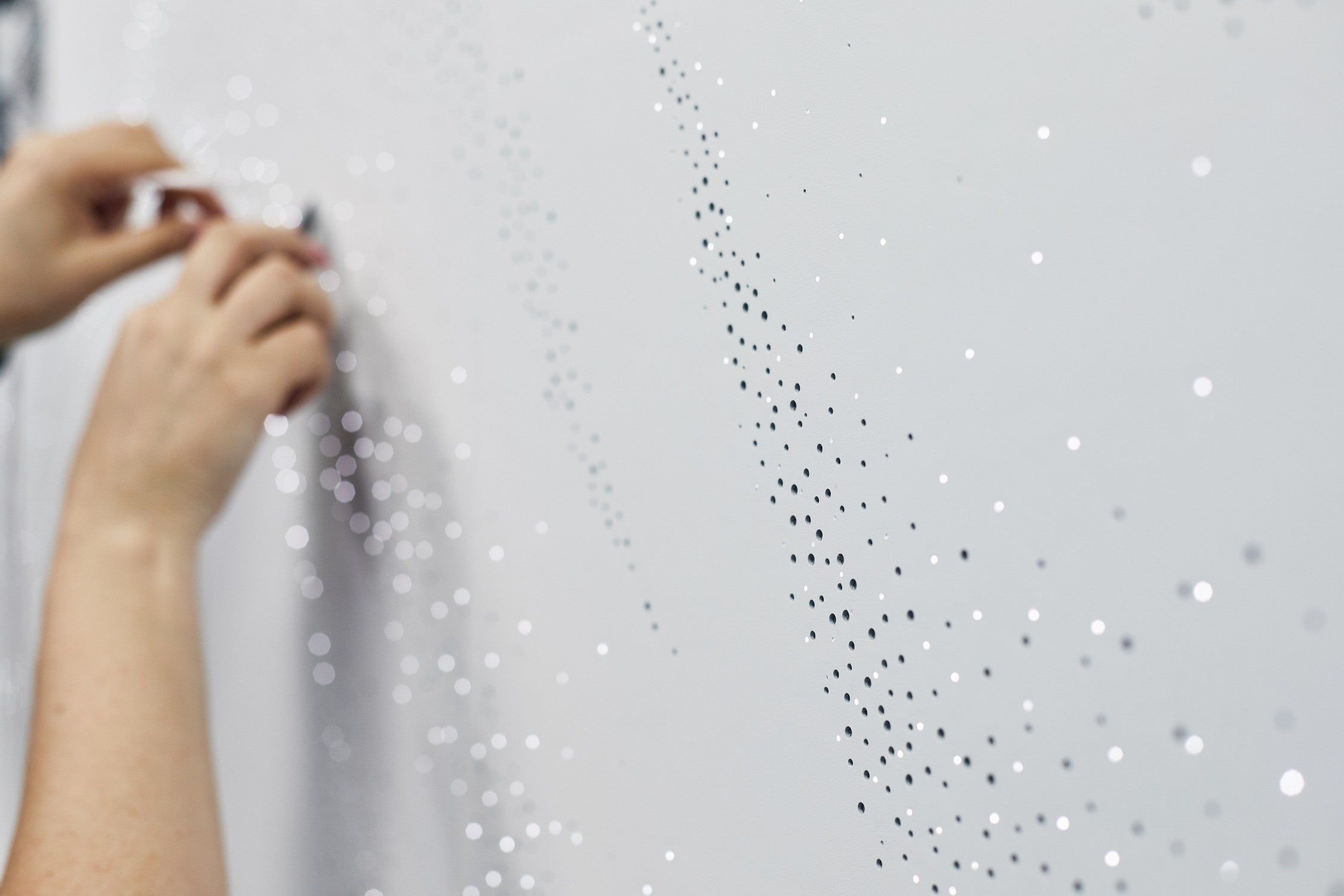 ファントム・シンティラのビスポークのスターライト・ヘッドライナーは、スピリット・オブ・エクスタシーの流れるようなドレスにインスピレーションを得たアニメーションが特徴です。すべて手作業で独自のパターンで配置された1,500個の光ファイバーの「星」が順々に光を放ち、動きのある感覚を演出します。さらに、通常よりも意図的に大きめに作られた4,450個のパーフォレーションから、その下にあるメタリックシルバーの生地がのぞき、微妙な光の相互作用を生み出しています。