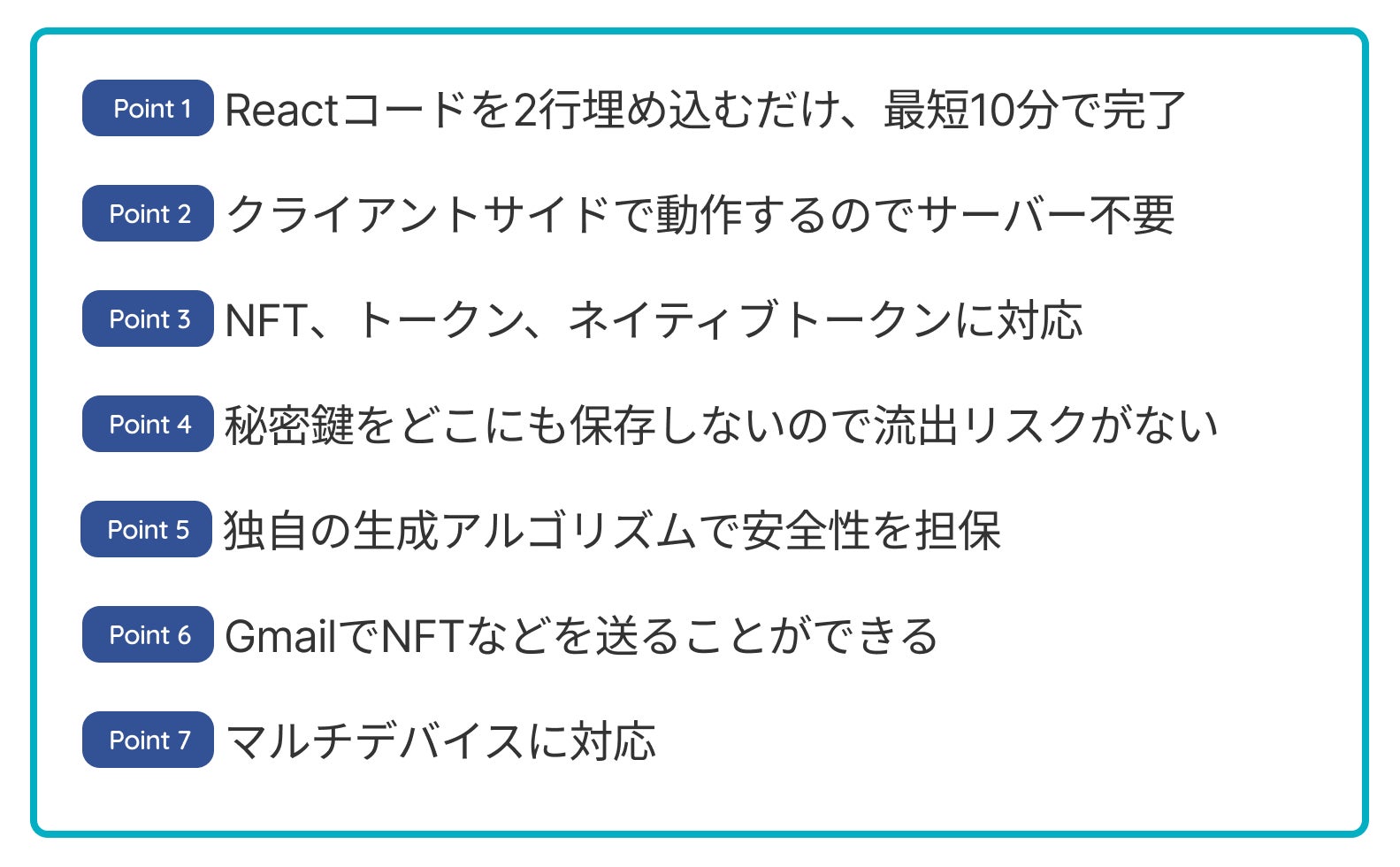 Nokey Walletは、Googleアカウントを使用してGoogleログイン後にブロックチェーンウォレットを安全に生成します。Googleアカウントは広く普及しており、どこでも利用できるため、連携することで利便性が非常に高いウォレットです。React(JavaScriptライブラリ)のタグを埋め込むだけで、簡単にウォレットを生成できます。クラウド型ウォレットとは異なり、ユーザーの個人情報を特定の企業やサービスに預ける必要がないため、特定のサービスにロックインされる心配もありません。また、Nokey Wallet内でのNFTなどの資産の送信は、Gmailアドレスを使用して行えるため、ユーザーはウォレットアドレスを気にする必要がありません。安全性と利便性を両立させたNokey Walletで、ブロックチェーン体験をより快適にすることができます。