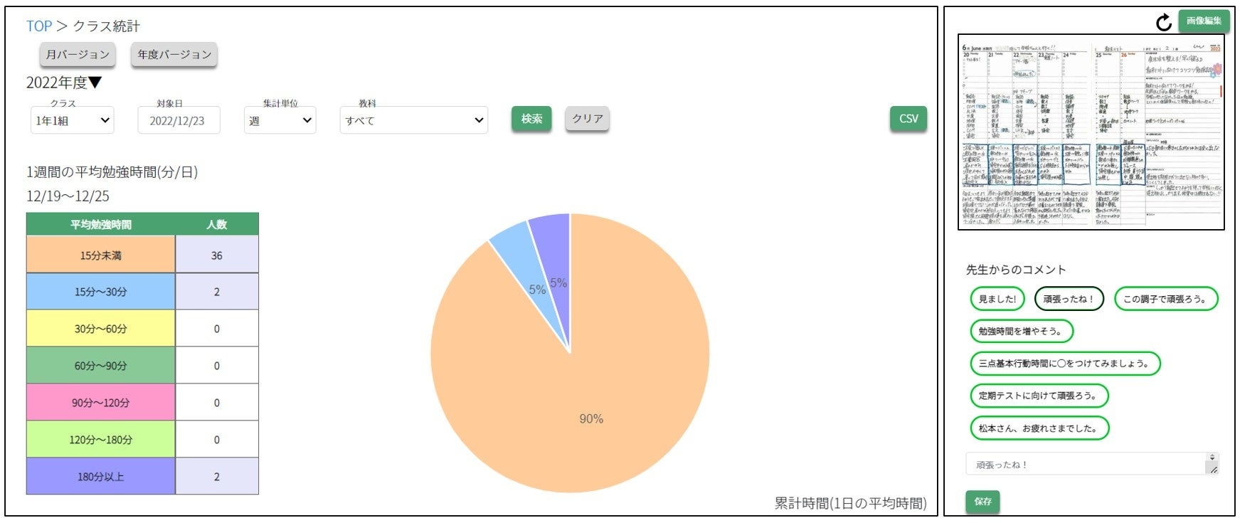 先生側では生徒の積み上げグラフの確認とクラス・学年・教科ごとの集計を見ることができます。提出された手帳には、定型文を用いて簡単に承認やコメントが作成できます。