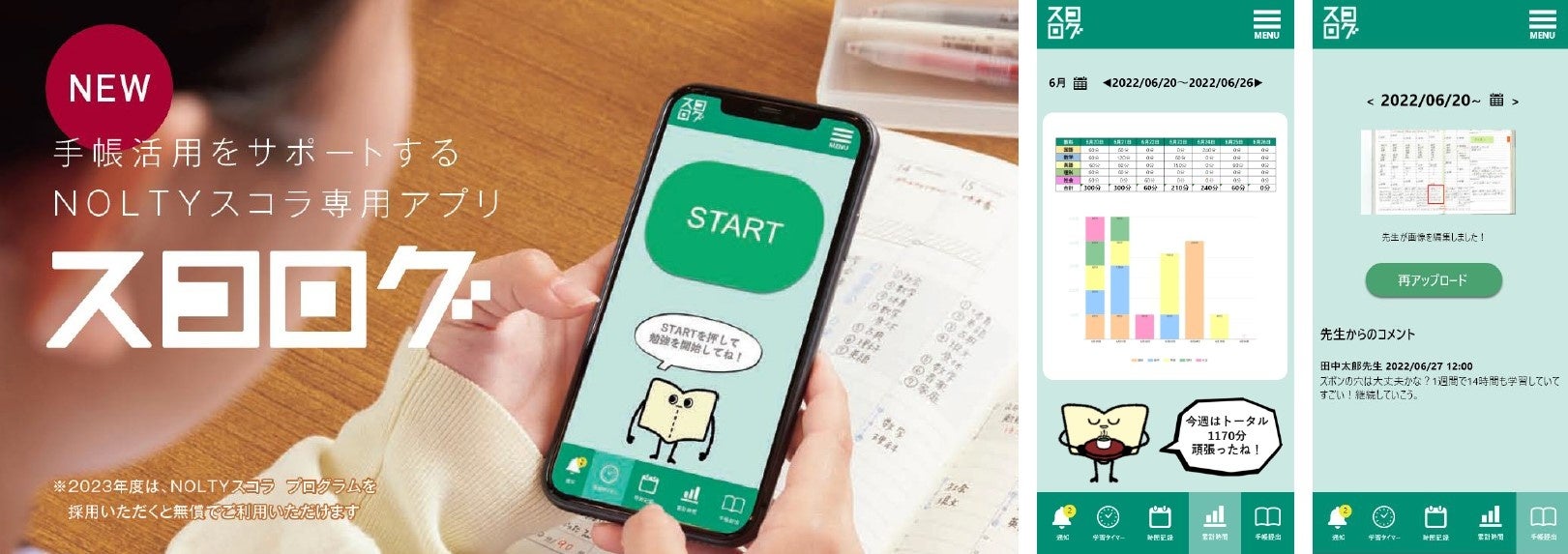 株式会社NOLTYプランナーズが中高生向けに提供しているスコラ手帳シリーズ。4月より生徒向けアプリ「スコログ」が新サービスとしてスタートします(一部学校にて先行実施中)。 生徒が「手帳」と「スコログ」を一緒に使うことで、勉強や部活など生活全体を可視化し、これまでに無かった質の高い振り返りや指導につながります。