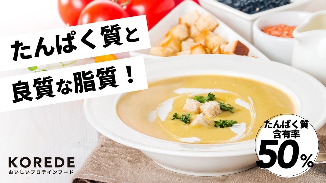 お食事系プロテインというのは、水を入れて混ぜるだけでできる高タンパク高栄養のスープやカレーです。プロテインというと甘いもの、おいしくないもの、トレーニングをしている人が飲むものと思われがちですが、私たちが作っているKOREDEは、食事と一緒に食べられるプロテインです。
