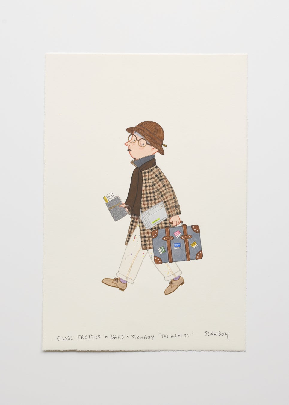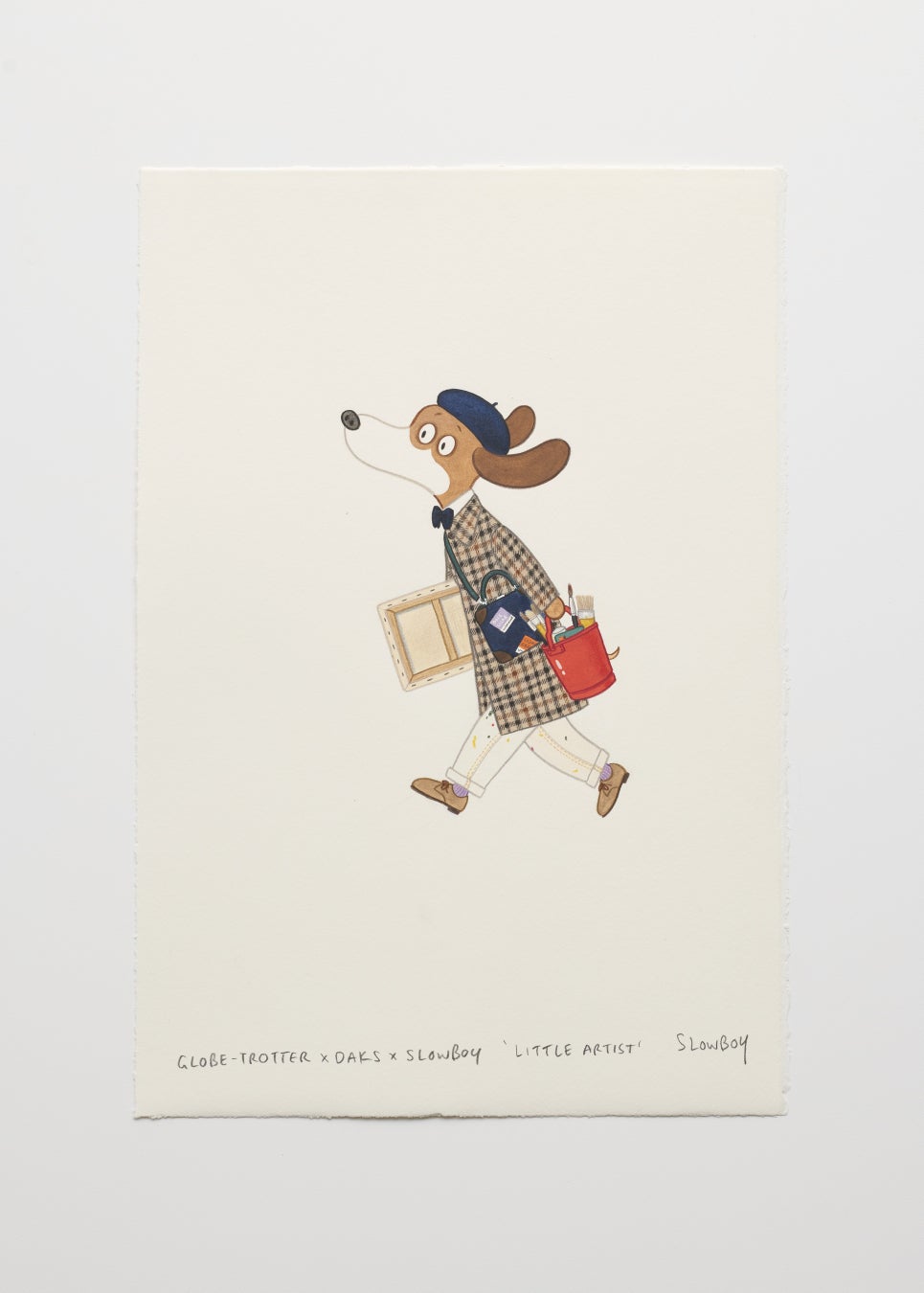 トリプルコラボレーションしたスーツケースにプリントされている、Mr. Slowboyが自身を描いたイラスト『The Artist』と、その仲間であり、DAKS×Mr Slowboyの愛すべきマスコットであるダックスフンドの「マックス」を描いたイラスト『The Little Artist』の貴重な原画作品を出品いたします。(各1点、計2点)