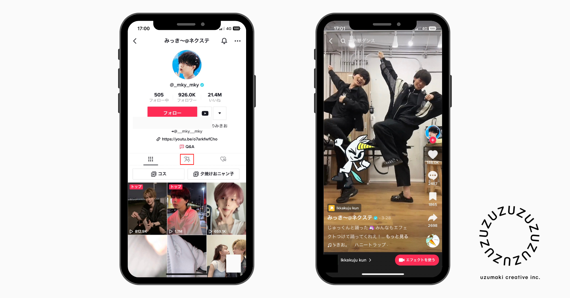 Z世代向けSNSマーケティング事業を展開する、株式会社uzumaki creative(本社:東京都渋谷区、代表取締役:木田陽真、以下:uzumaki creative)は、YouTubeチャンネル”みきおだ”メンバー「みっき〜。」様のTikTok上の動画投稿やストーリーズで活用できるARエフェクト・フィルターをリリースいたしました。