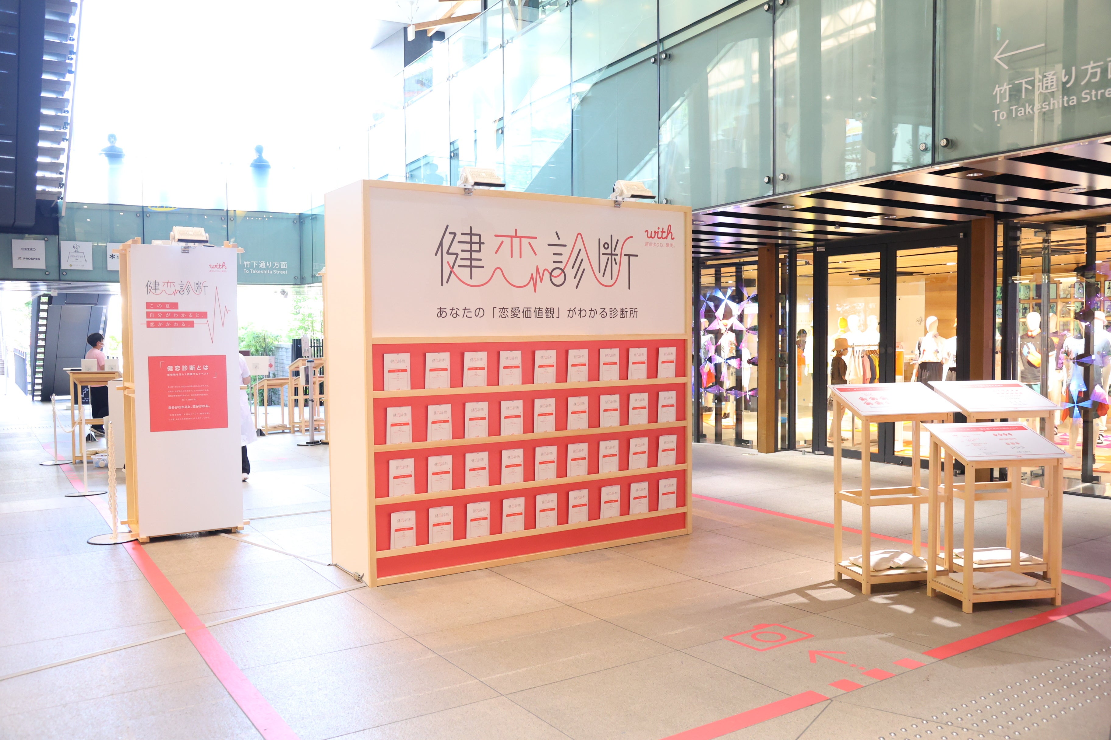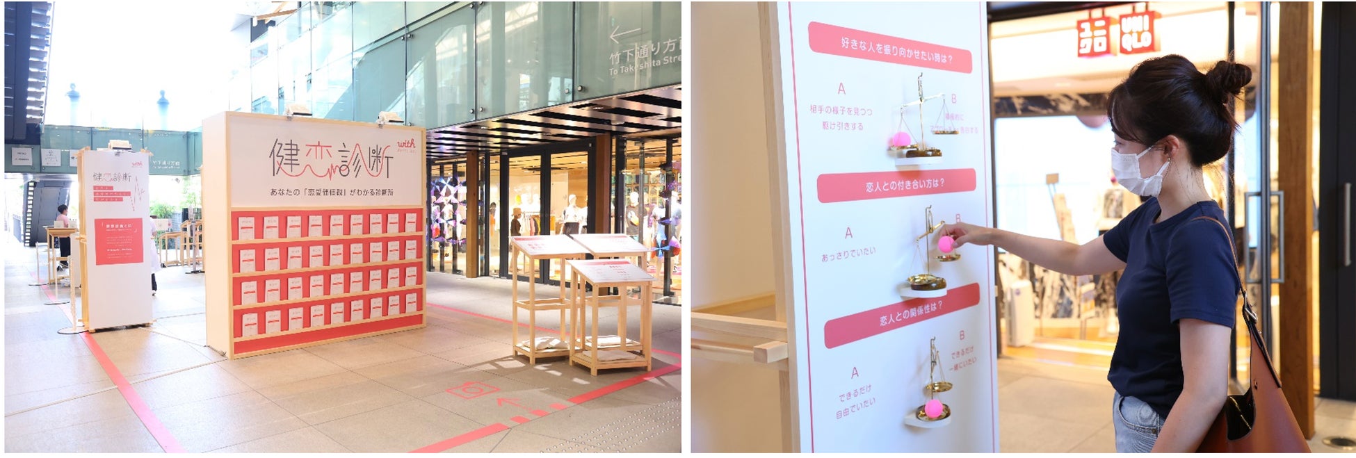 第一弾は、2021年12月、株式会社丸善ジュンク堂書店とコラボし「良縁書店」をオープンしました。「良縁書店」は、全国の丸善ジュンク堂書店で販売する約3,500万冊の書籍の中から、書店員がピックアップした選りすぐりの恋愛本が一挙に集結。withが蓄積する診断データと価値観マッチングのノウハウを用いて、「恋愛価値観」による人と本の出会いを提供しました。第二弾の「これどう?展」では、東急プラザ表参道原宿とコラボして、日常のよくあるシーンの2択問題に投票することで、自分や恋人およびパートナーの「恋愛価値観」を発見できる場を展開しました。そして今回は第三弾として「健恋診断」を実施いたしました。