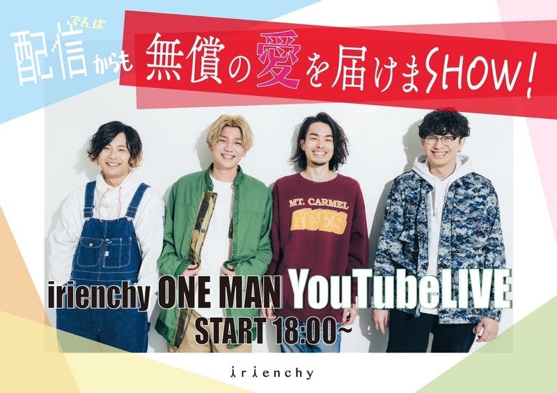 元MOSHIMOのベース宮原颯とドラムの本多響平が新たに結成した、とことんハッピーな4人組irienchy(イリエンチー)。ここでは宮原がVo&Gtを担当、Gtに島根出身の諒孟(まさとも)、Baに長野出身の井口裕馬(いぐちゆうま)を迎えた。なかなかライブがままならない2年間を乗り越え今年に入って鬱憤を晴らすような怒涛のライブ活動を再始動。しっかり構築されたカラフルなバンドサウンドを背に縦横無尽に泳ぐようなボーカル宮原のファニーで切ないキュートボイスが若い世代の女子を中心に急激に話題を集めている。