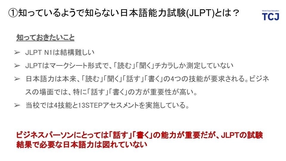 徳田は、採用基準に使用されることの多い日本語能力試験(JLPT)をまず取り上げ、JLPTでは職務の遂行に欠かせない話す力、書く力は測定されないため、最高位のN1取得者であってもコミュニケーションが取れるか確認する必要があることを解説しました。