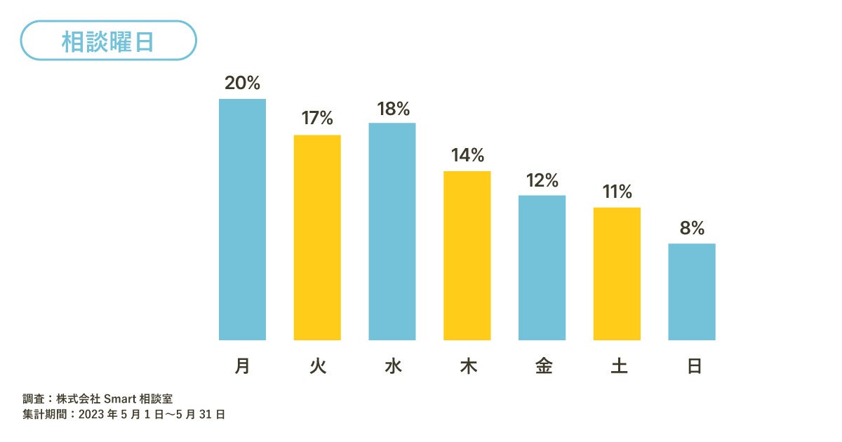 曜日別に見ると、月曜日が最も高く20%、週末に向かって徐々に比率が落ちていき、土曜日が11%、日曜日が8%でした。