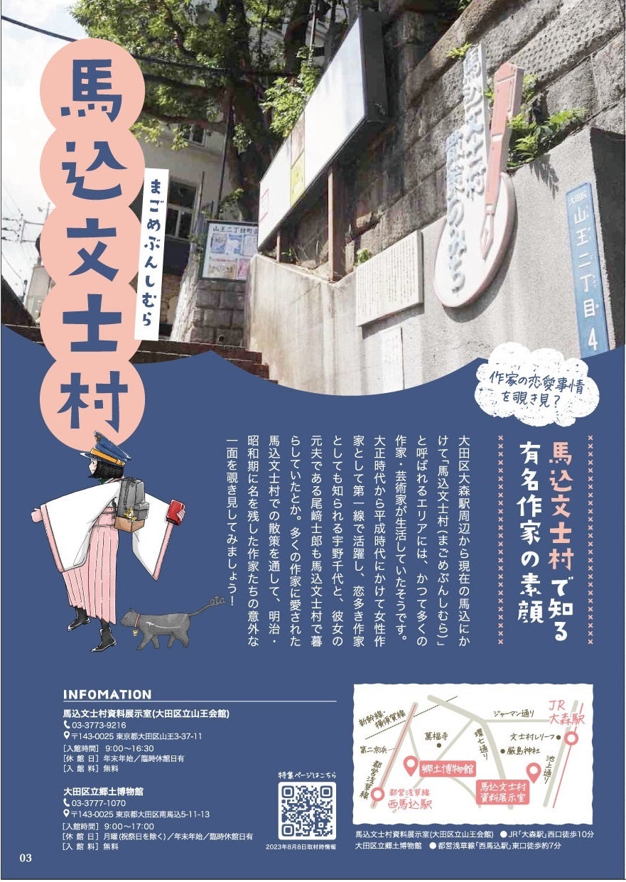作家・芸術家たちの結婚・離婚などの恋愛遍歴や、実際に馬込文士村のどの辺りに住んでいたかなどが分かる「馬込文士村資料展示室」や宇野千代直筆の書簡が展示してある「郷土博物館」