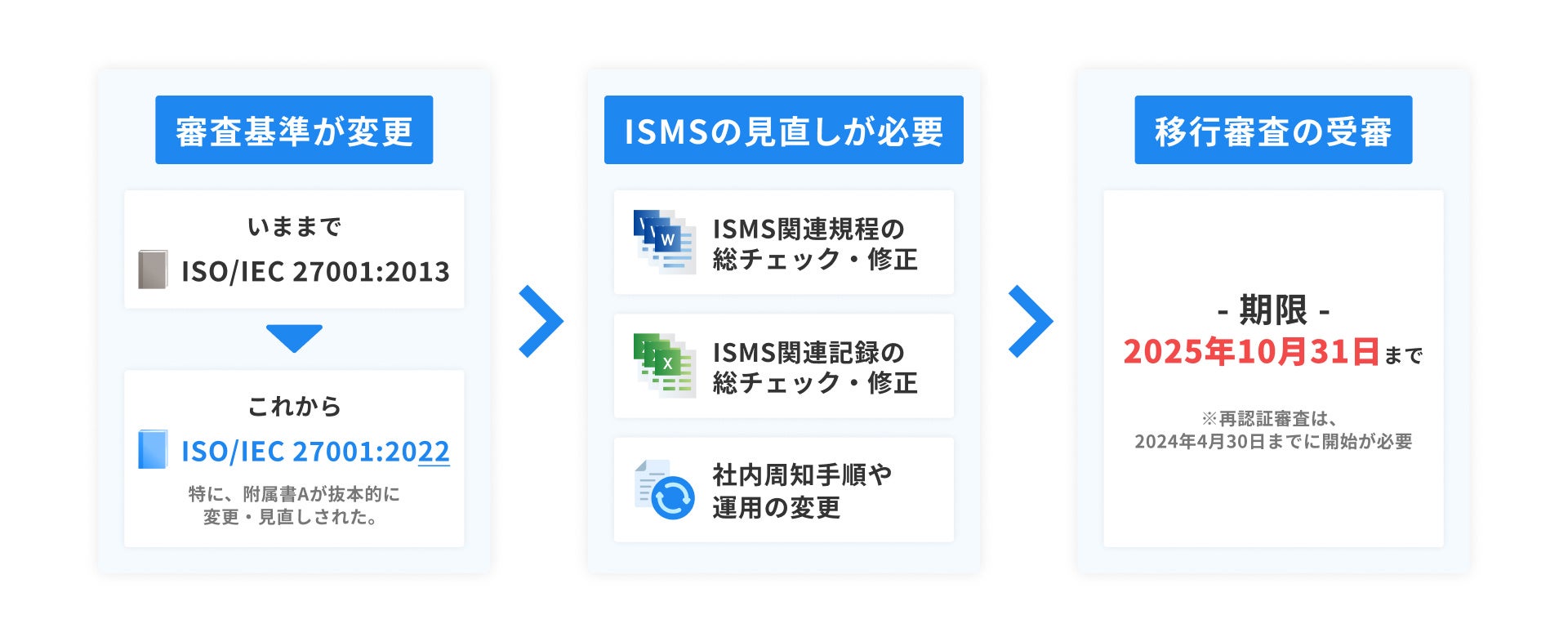 新規格の登場により、ISMS認証を取得している全ての組織は、遅くとも2025年10月までの対応が必須となりました。しかし、新規格は難解なため、理解は容易ではなく、その対応に手間もかかります。また、外部のコンサルタントに対応を依頼した場合、多額の費用が必要となることもあります。