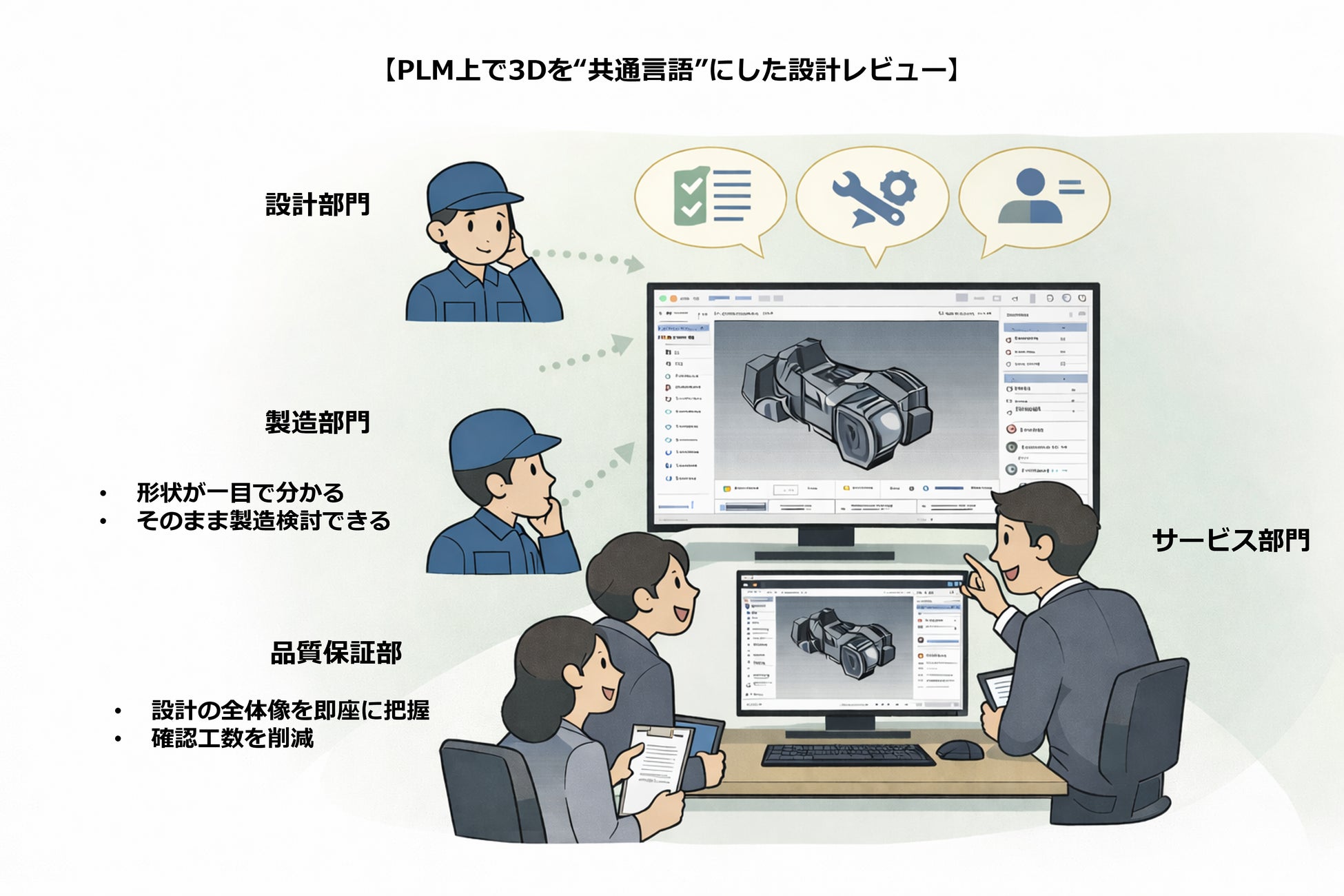 3Dビューアー機能の導入により、設計者を中心とした関係者全体で3Dデータを共通言語として扱えるようになり、設計レビューの質とスピード向上が期待できます。