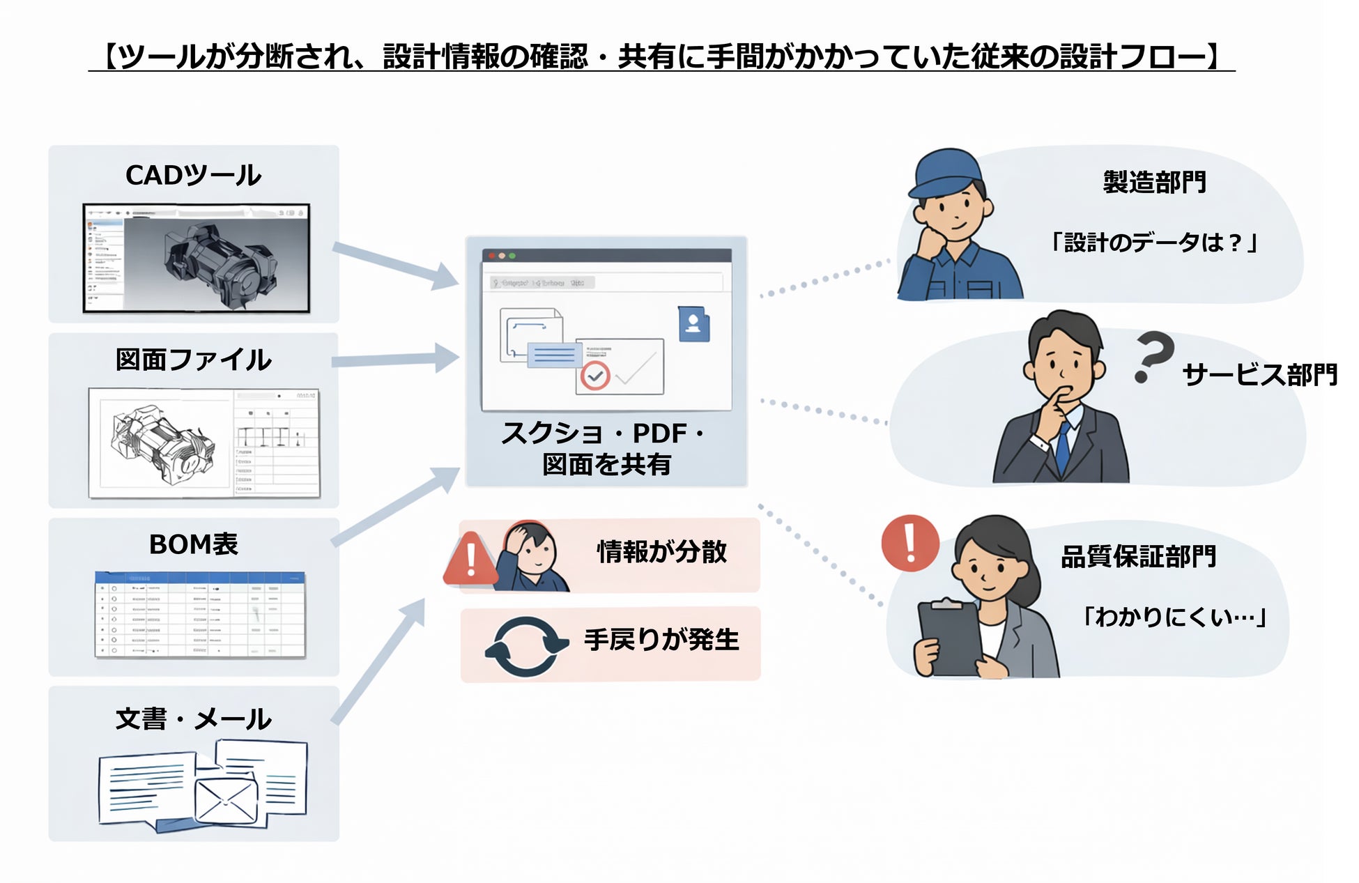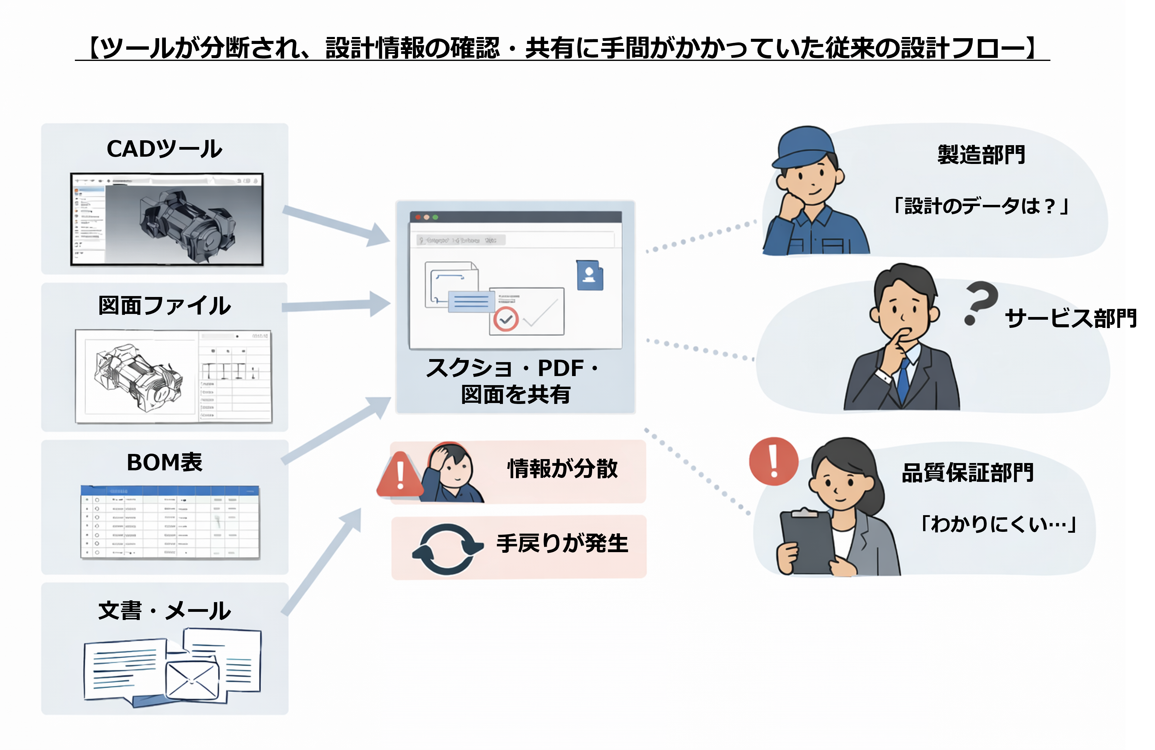 図面、BOM、仕様書、コメントがツールごとに分散し、情報の行き来に時間がかかる