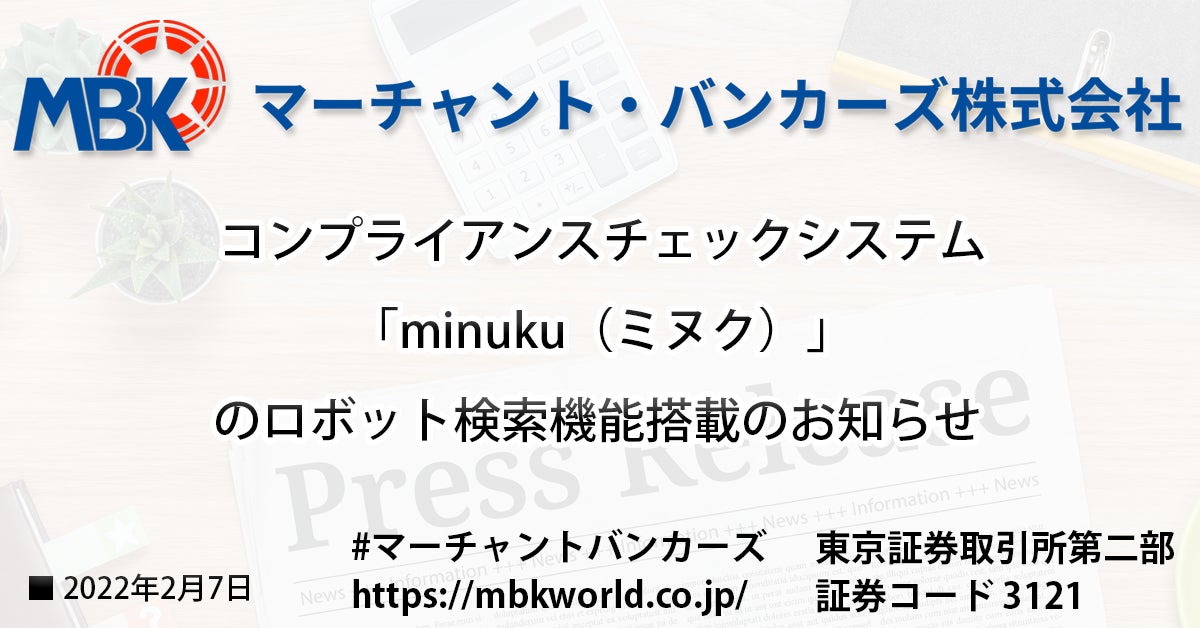 当社マーチャント・バンカーズ株式会社が、株式会社セナードと業務提携し、販売を行っておりますコンプライアンスチェックシステム「minuku(ミヌク)」は、今般、ロボット検索機能を搭載し、大幅バージョンアップのうえ、 2022 年 2 月 7 日より、販売を開始いたしますので、お知らせいたします。