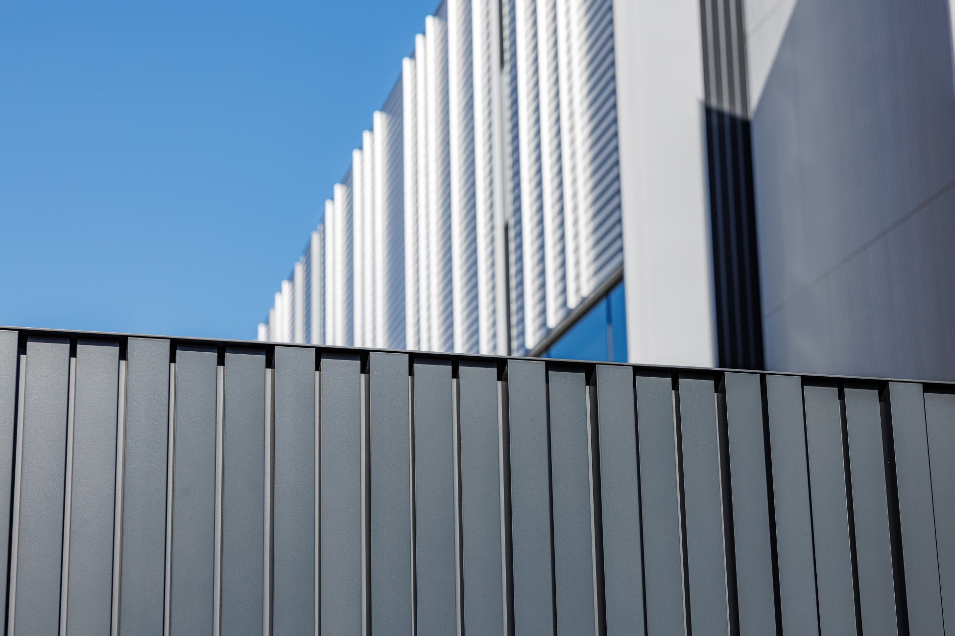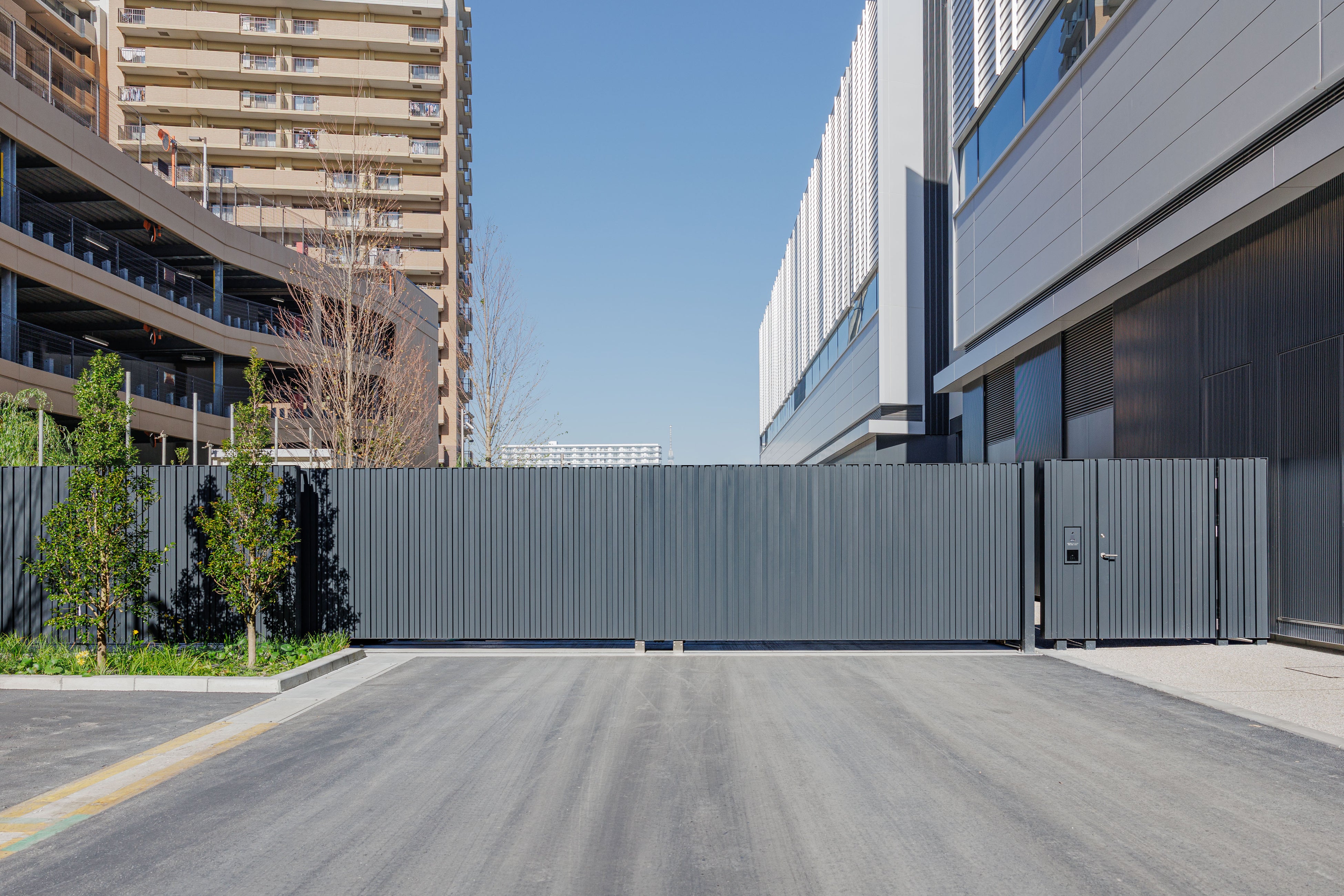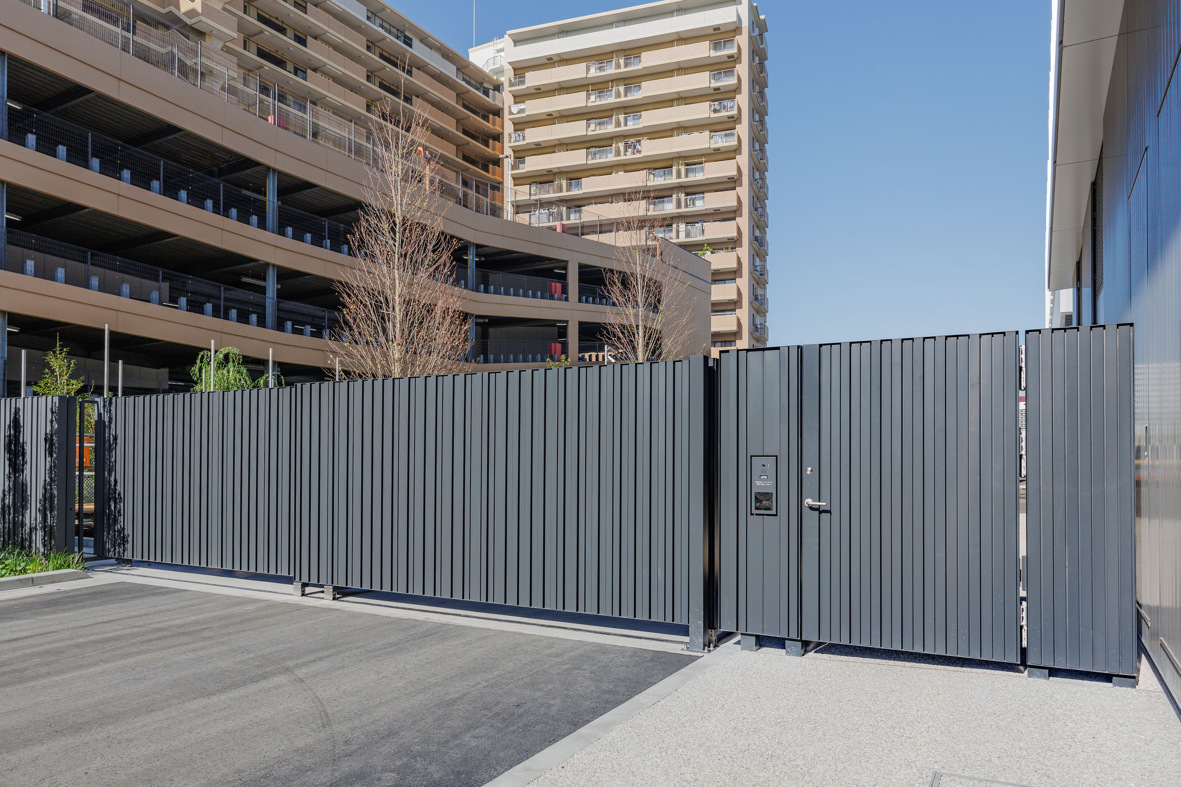 今回採用されたヒガノ製のゲートは、ランダムに配置されたスパンドレルの意匠が特徴的でありつつ、最新鋭の警備巡回ロボットと連携した自動開閉を実現することでセキュリティを強化しており、変わりゆく時代やシステムへ柔軟に適応することで、新たなイノベーション拠点の一助となっています。