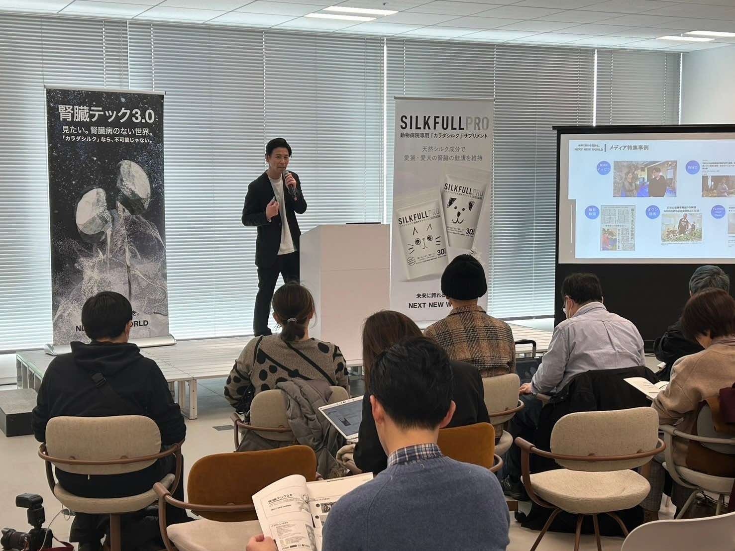 その後、現在国内で注目されている「腎活」について説明したうえで、当社取締役の旭恭平より新商品である「SILKFULL PRO(シルクフルプロ)」の説明を行いました。SILKFULL PRO(シルクフルプロ)は、1包あたり160mgのシルクフィブロインを含有。これは一般向け商品の約1.8倍の量にあたります(当社比)。これにより、腸内で窒素代謝物を吸着し、便とともに排泄することで血中の尿素窒素濃度(BUN)を低下させる効果が期待できます。一般向け商品よりも多い用量のシルクフィブロインを含有している一方で、30日分の小売価格は5,500円(税込)とし、一般向け商品よりも約27%割安な価格を実現しました。3月から日本最大の動物用医薬品卸『NPCグループ』と契約をさせて頂き、全国の1万軒の動物病院へ営業を開始いたします。