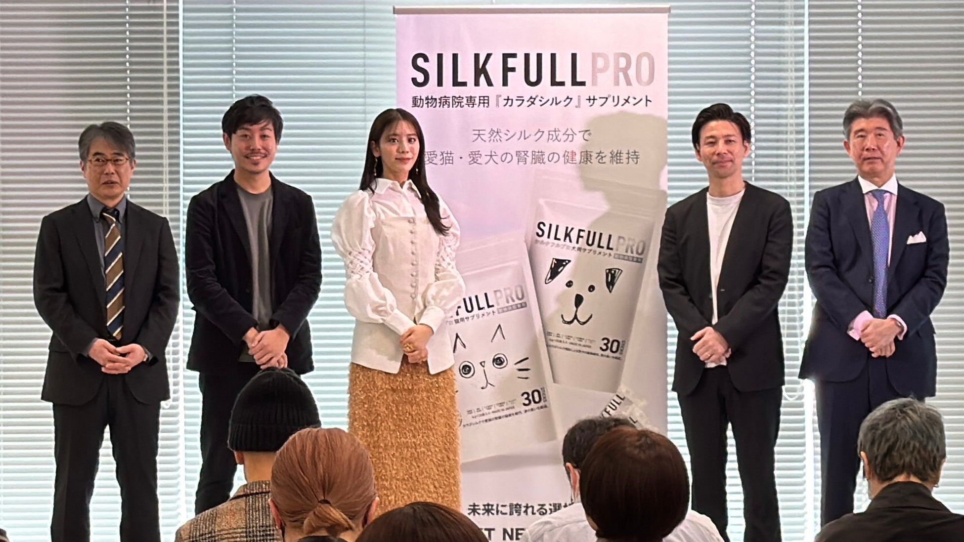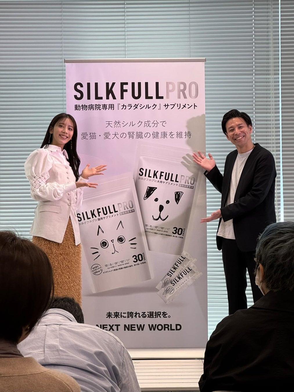 シルク由来のタンパク質を活用した「腎臓テック3.0」を展開する、株式会社NEXT NEW WORLD(本社:群馬県桐生市、代表:髙嶋耕太郎)は、特許製法を取得したシルク成分「シルクフィブロイン」を内容成分とした動物病院専売サプリメント「SILKFULL PRO(シルクフルプロ)」を2025年3月3日(月)より販売を開始、随時発送することをお知らせいたします。本商品の販売開始に先立ち、2025年2月21日(金)に愛猫家の貴島明日香さんや、苅谷動物病院グループ市川総合病院 顧問 伊藤裕行 獣医師を招いた発表イベントを実施いたしました。
