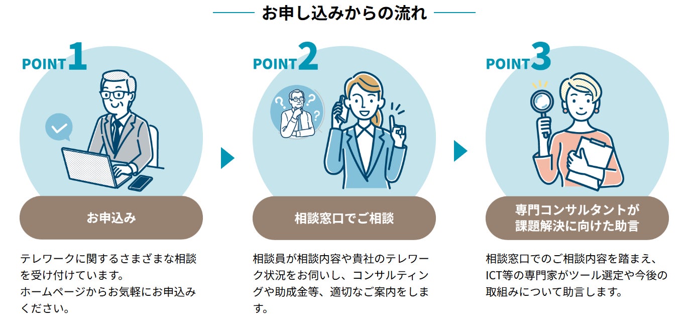 テレワークトータルサポート事業の相談窓口では、相談員が相談内容や貴社のテレワーク状況をお伺いします。
