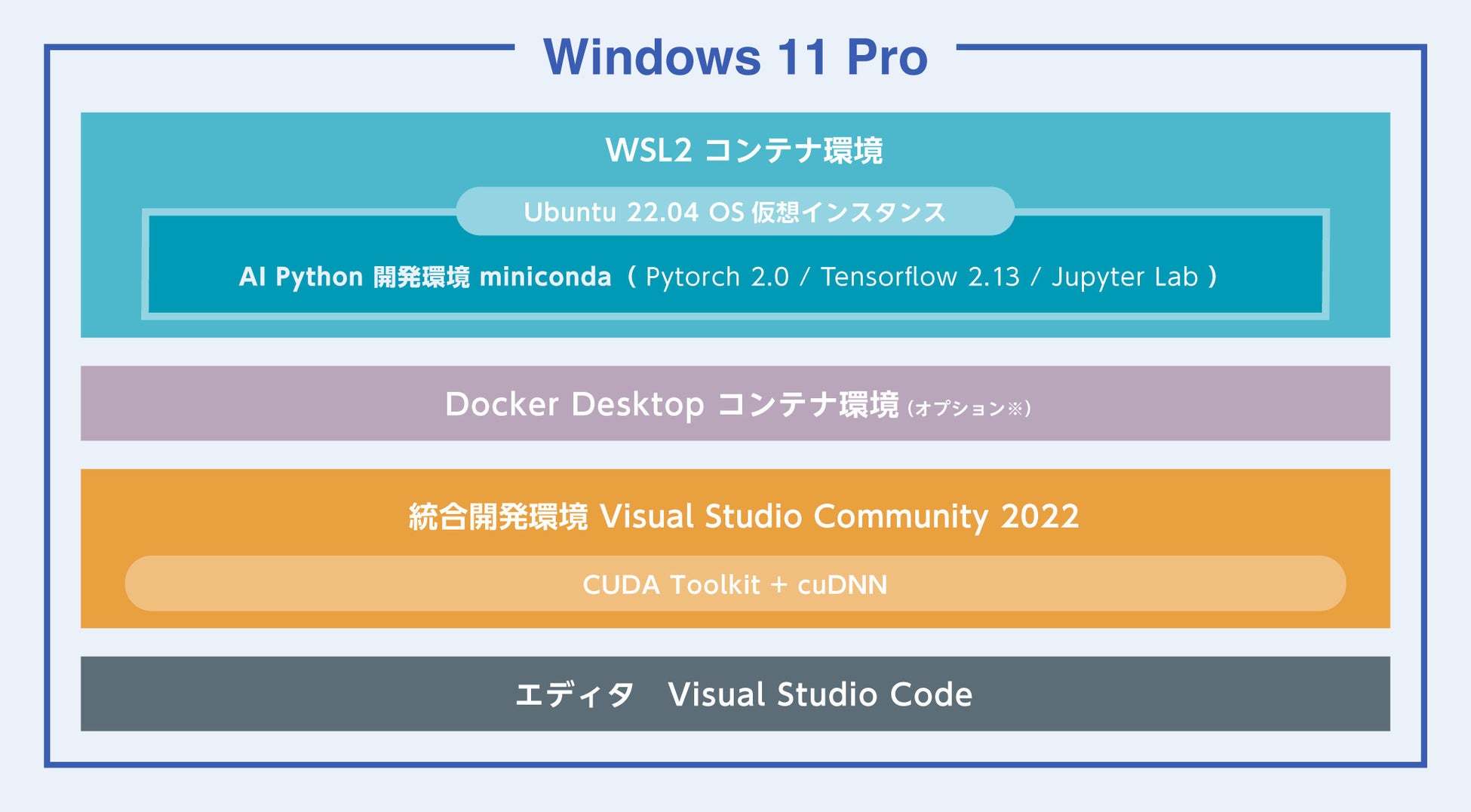 Windows 11 Pro WSL2において以下のコンテナ環境でAI開発環境が提供されます。