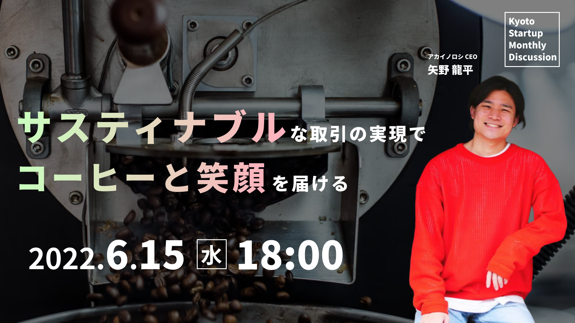 6月のKyoto Startup Monthly Discussionは、「サスティナブルな取引の実現でコーヒーと笑顔を届ける」をテーマにタイの現地のコーヒー豆の農園に通い、輸入、焙煎、販売までを一貫して行い、高いクオリティとサスティナブルな取引を実現され、京都西陣において珈琲自家焙煎店「Laughter」を経営されている『株式会社アカイノロシ』CEOの矢野 龍平 様にご登壇いただき、タイのコーヒー豆との出会い、起業前後における様々な課題の克服、京都を拠点にスタートアップをする理由などをお伺いします。