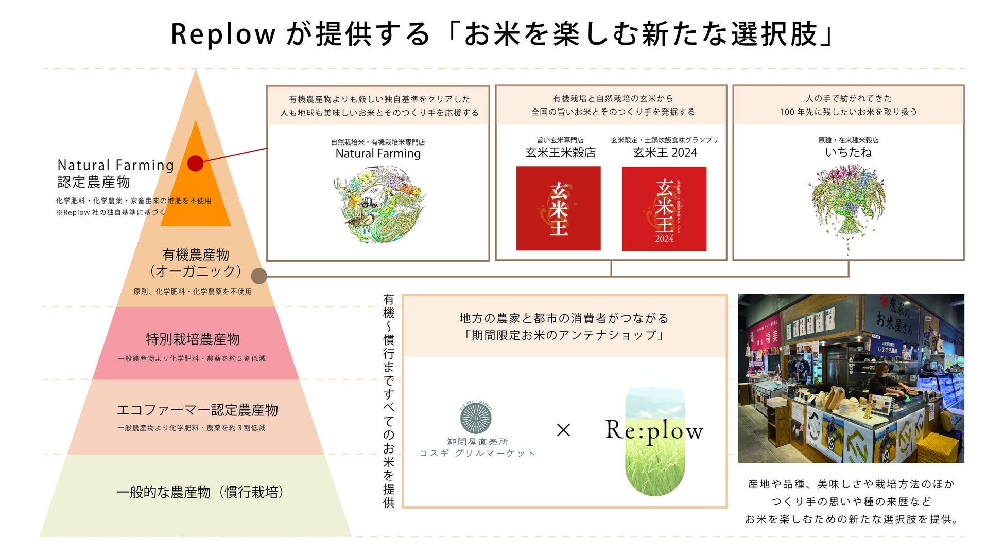 これまで、私たち米屋ができることの一つとして「ナチュラルなお米の選択肢をつくる」取り組みを続けてきました。「自然栽培米・有機栽培米専門店 Natural Farming」のオープンや、自然栽培または有機栽培の玄米を審査する食味グランプリ「玄米限定・土鍋炊飯食味グランプリ 玄米王」の開催など、環境に配慮した地球にやさしいお米であることを前提に、ナチュラルなお米や旨い玄米という切り口で新たな米需要を生み出す選択肢を作ってきました。加えて、2024年5月には、放射線育種ではない昔ながらのお米を取り扱う「原種・在来種米穀店 いちたね」をオープンしています。