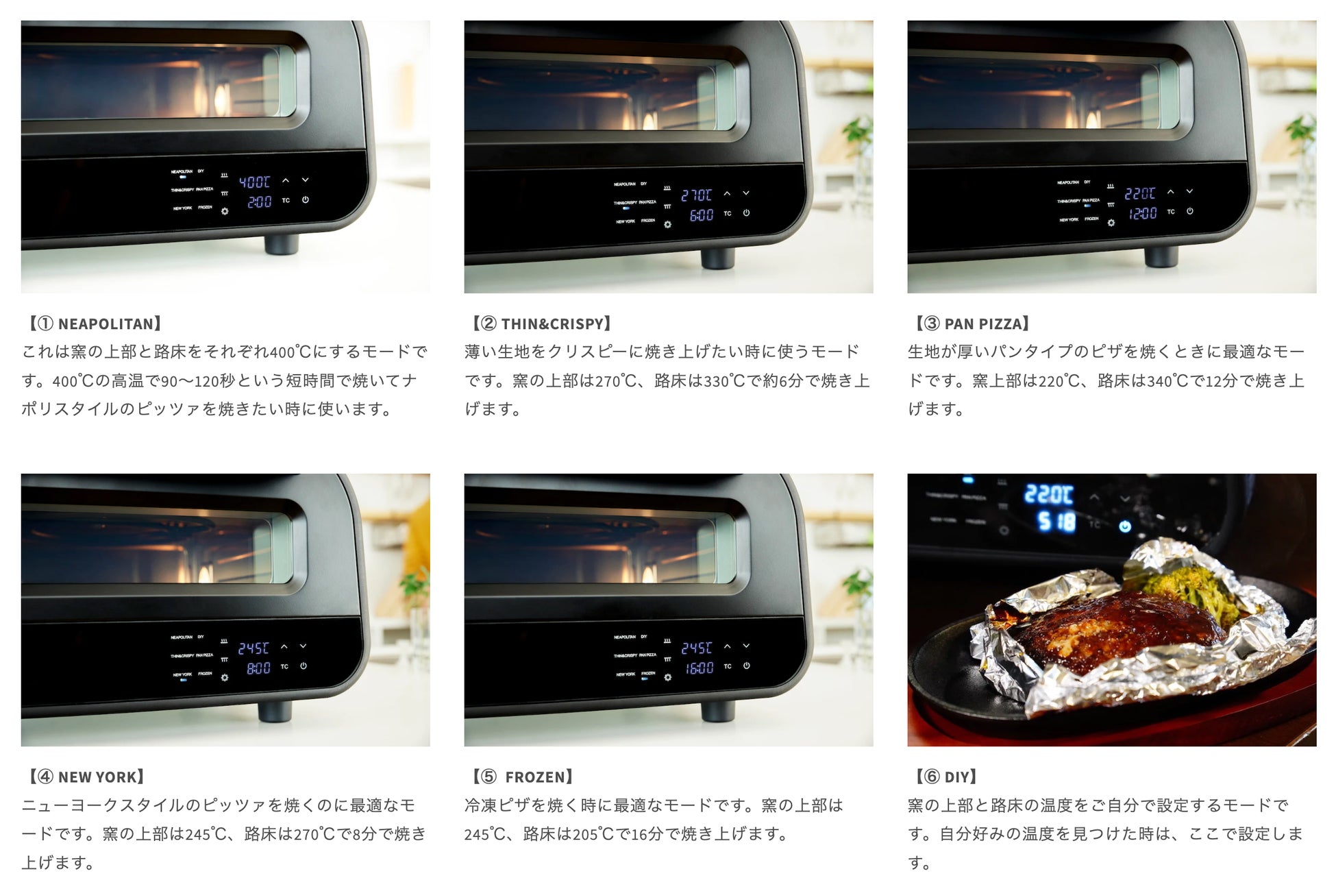 ピザの種類によって適正温度は異なります。そのため「電気式窯焼名人」には6つのモードがあります。