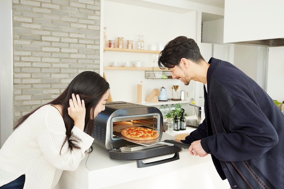 屋内のキッチンで使えるから超手軽。なのに400℃の高温が出せて、約120秒で焼け上がるからお店レベルのピッツァに仕上がる!