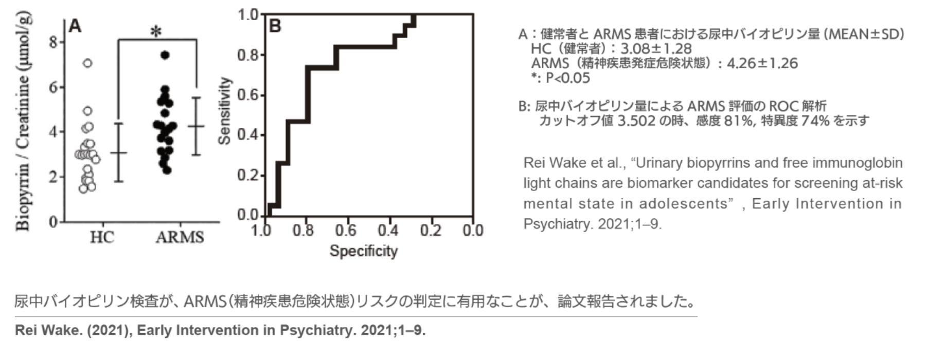 メンタルストレスが引き金となって精神疾患を発症させる際に、体内の活性酸素の生成が関係していることが学術的に分かってきました。体内で活性酸素が多くなると尿中に“バイオピリン” という物質が増加します。バイオピリンは、過度な心理的なストレスを受けた時や、精神疾患にかかると顕著に増加することが報告されています 1-6。2021 年5月、島根大学医学部 (和気、宮岡、大西ら)は、精神疾患を発症させる前の状態である“精神疾患発症危険状態 (ARMS)” において、尿中バイオピリン濃度が増え始めることを発見し、精神病の発症前のリスクを知るために有用であることが提唱されました。