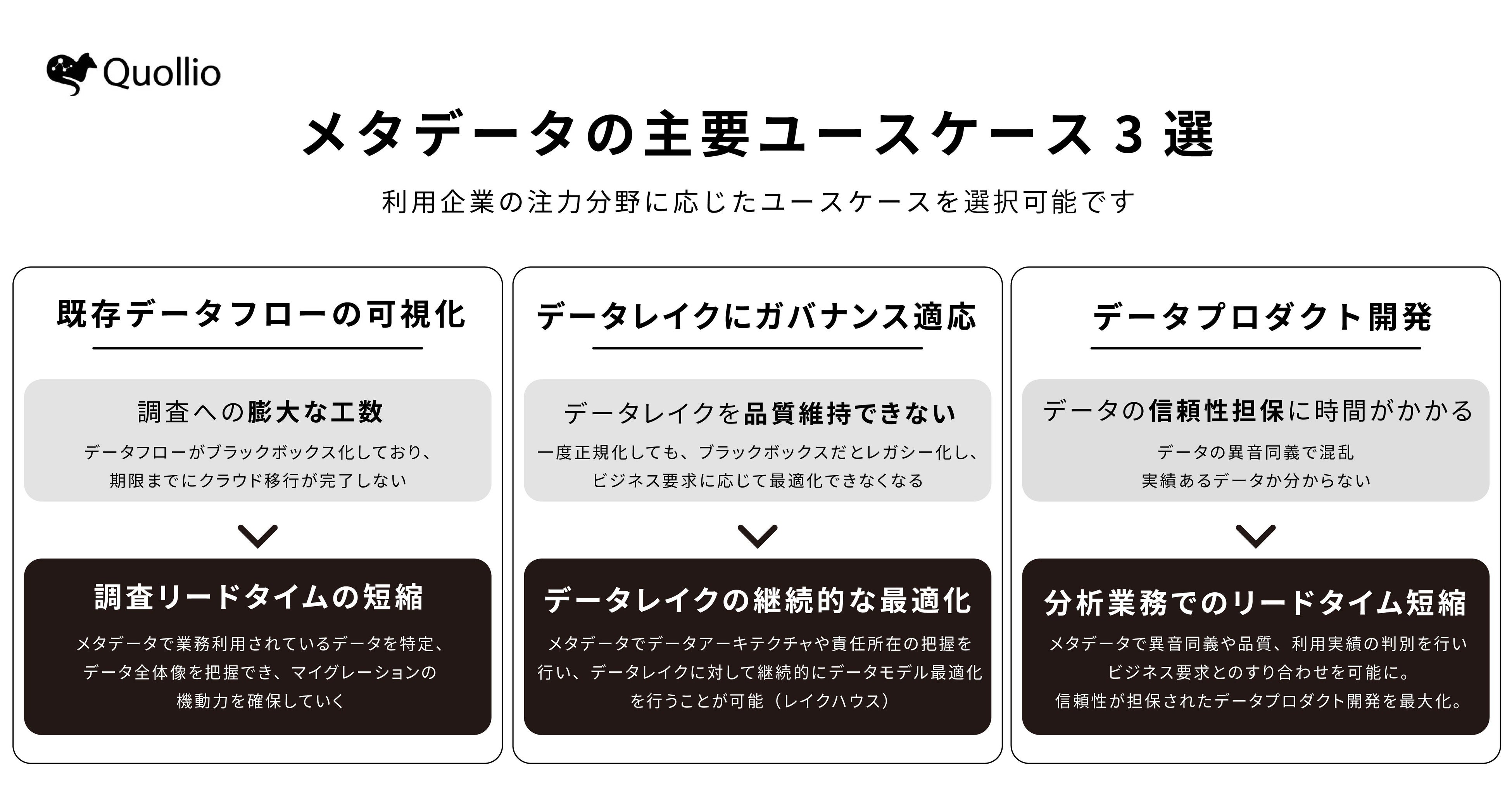 世界中の情報と知を繋げ、人々や企業が繋がり、新たな価値創造を促進する未来を築くことをミッションとしているデータテクノロジーパートナーです。Quollioは、メタデータ管理技術とソフトウェア開発力を軸に、企業のデータにまつわる経営課題を解決し、社会のデータ & AIからの価値創造を促進します。