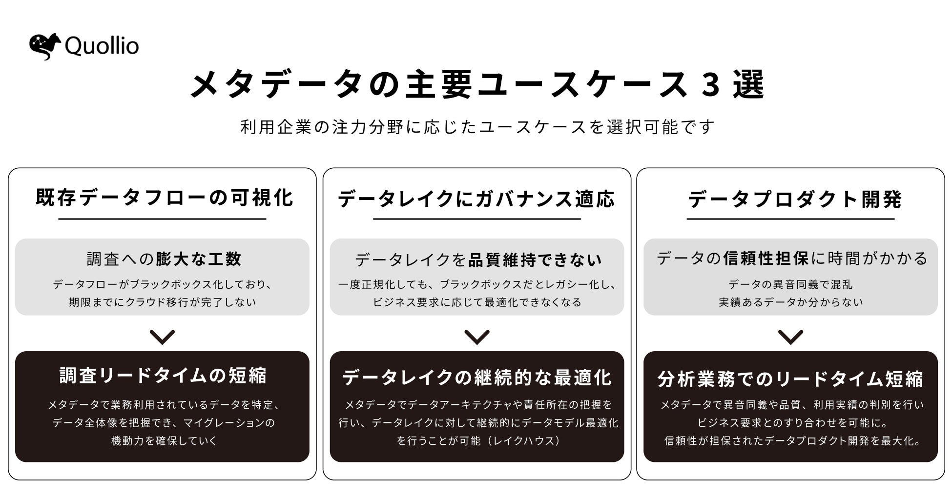 企業IT動向調査報告書*2によれば、国内の売上1兆円企業の約7割が既にメタデータ管理に取り組んでおり、この取り組みが企業にとって喫緊の課題であることが示されています。また、経営者のためのデータ読本*3によれば、データの棚卸しとカタログ化がデータ経営実現にとって重要であると示されています。Data is new oilである今日において、Quollio Technologiesは更なる成長を遂げ、メタデータ管理技術とソフトウェア開発力を軸に、データ資産の管理に悩みを抱える大企業の経営課題を解決し、データやAIを活用した価値創造を後押しして参ります。