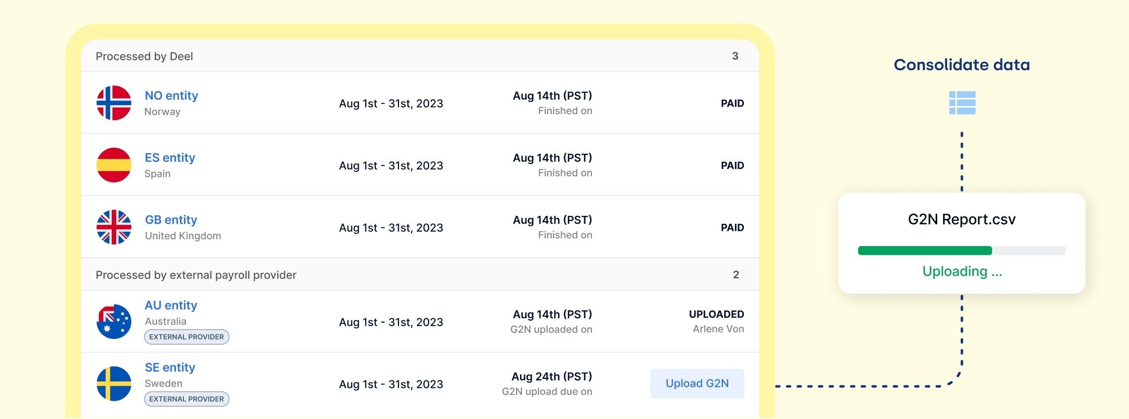 世界各国に労働力を持つ企業へのサービスです。ある国ではDeelで給与計算を行い、他の国では別の給与計算方法を利用する場合、Deelのプラットフォーム上で給与計算を統合することが可能です。