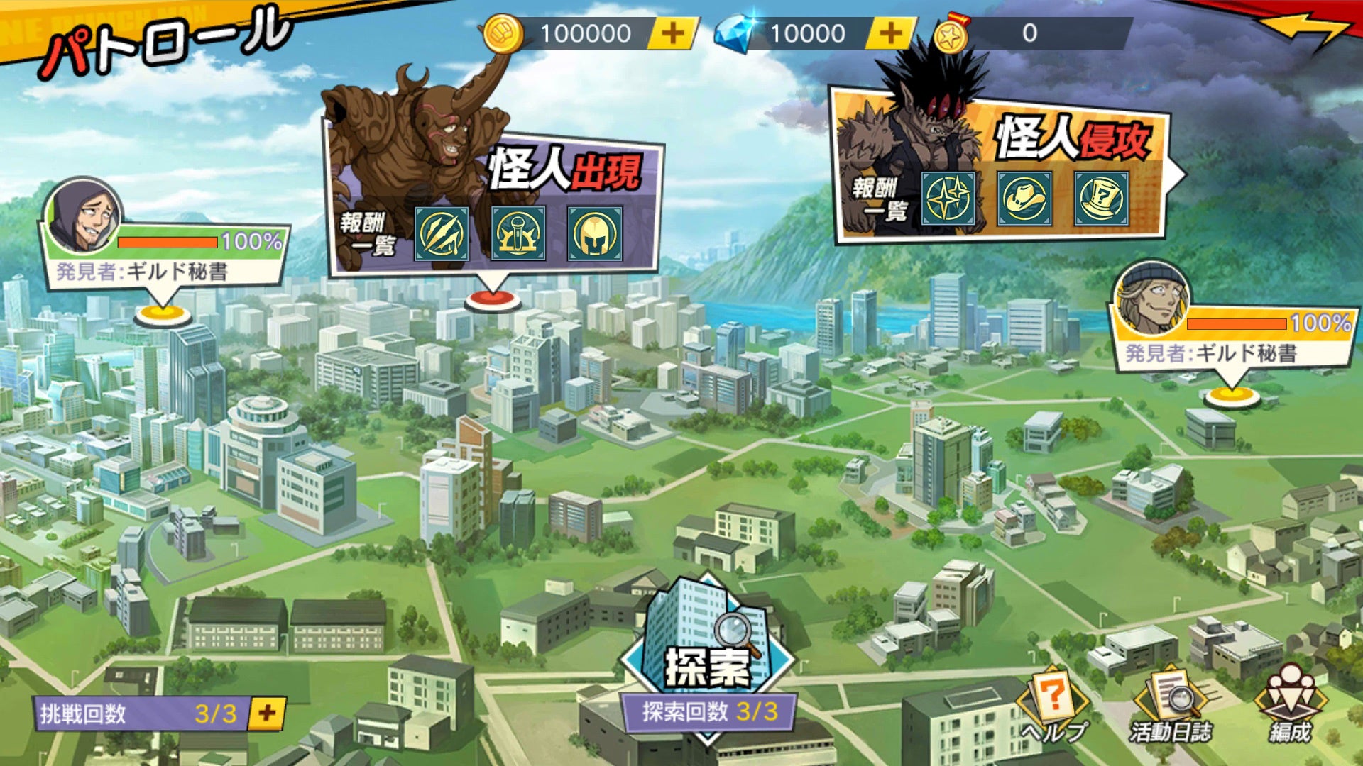 怪人侵攻は、ギルドメンバーと協力してボスにどれだけダメージを与えられるかを目指すコンテンツで、各プレイヤーごとに3チームを編成して挑戦します。ボスの弱点に合わせて少しでも多くダメージを与えましょう。