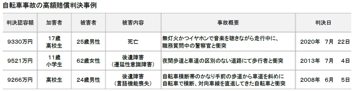 しかし、今回の調査で「自転車事故により高額な賠償事例が発生していることは、あまり知られていない」「自転車事故に備える保険への加入率は低い」ことがわかりました。