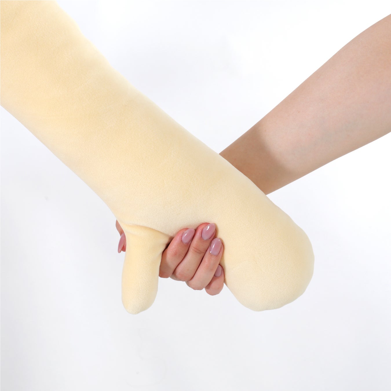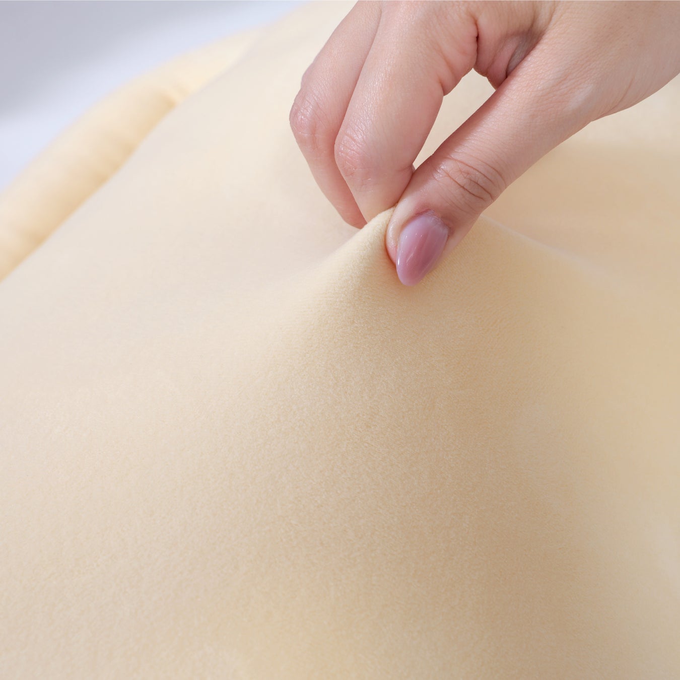 一般的な筒状の抱き枕では叶わない、腕枕や膝枕、手を繋ぐなどのあらゆる寝姿勢に対応。人型だからこその自由なポージングで、まるで推しが添い寝してくれているかのようなトキメキと安心感を同時に味わえます。中材には、ぬいぐるみにも使われるモチッと弾力感のある粒綿をたっぷり充填。首裏のファスナーから量が調節でき、お好みの抱き心地・ボディラインにカスタマイズ可能です。側生地には肌当たりの優しいなめらかな起毛素材を採用し、ずっと触っていたくなるような心地よさ。見た目のインパクトだけでなく、抱き枕としての機能性にもしっかりとこだわって作り上げました。