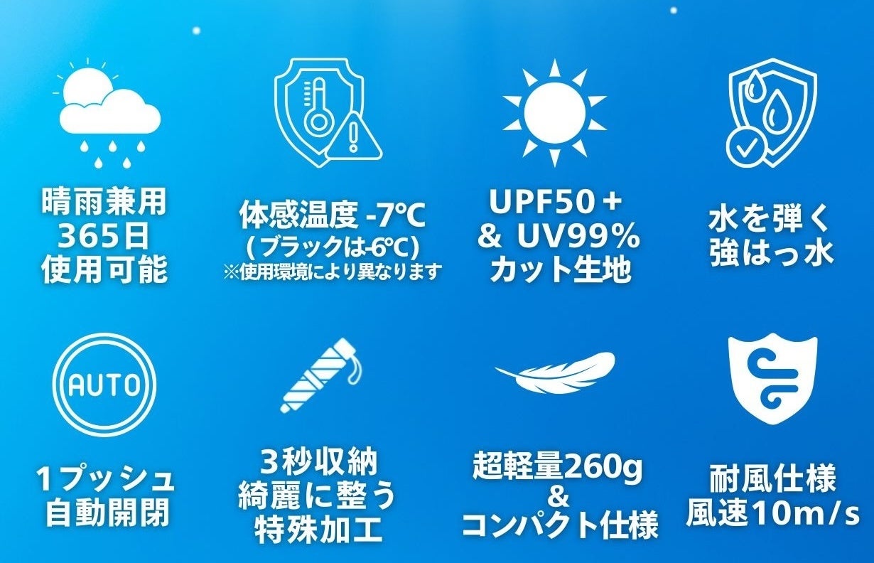 本製品は「3秒で整う収納力」と「遮熱-7℃」という快適性を融合させた、これまでにない“整う傘”として、暑さと収納ストレスに悩む現代人に向けて開発されました。