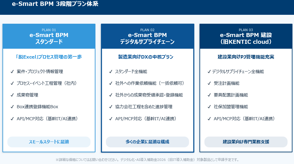PLCPが建設業向けプロジェクト管理クラウドとして実績を積み重ねてきた「KENTIC cloud」は、本リリースをもってAI時代に対応した業務プロセスデータ利活用基盤「e-Smart BPM」へフルバージョンアップいたします。既存のKENTIC cloudご利用企業様に対しては、積極的なバージョンアップ提案を推進中です。