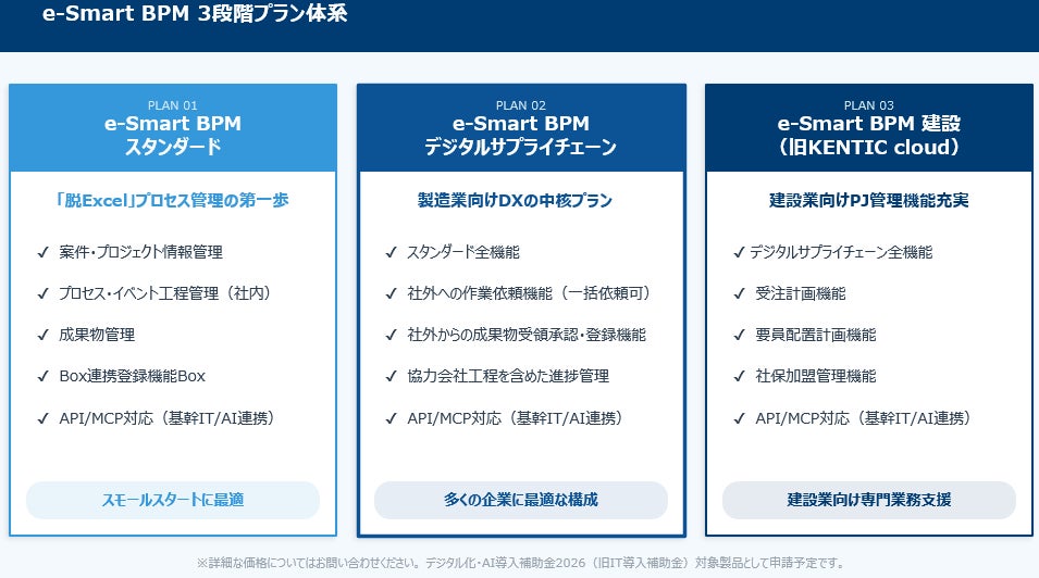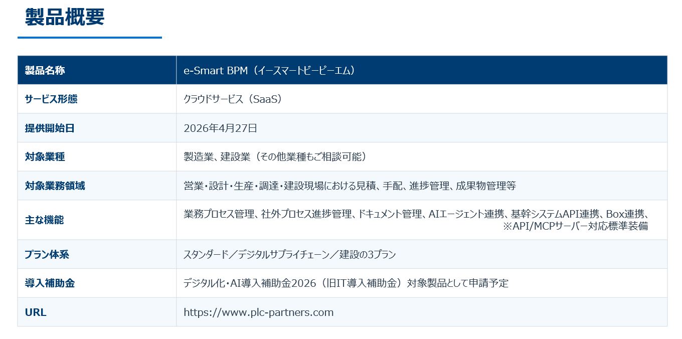 製造業・建設業向け業務コンサルティングおよびクラウドサービスを提供するPLCパートナーズ株式会社(本社:東京都品川区、代表取締役:人見正德、以下「PLCP」)は、従来建設業向けに提供してきたプロジェクト管理クラウド「KENTIC cloud」をAI時代に対応した業務プロセスデータ利活用基盤へフルバージョンアップし、「e-Smart BPM」として2026年4月27日より提供を開始いたします。