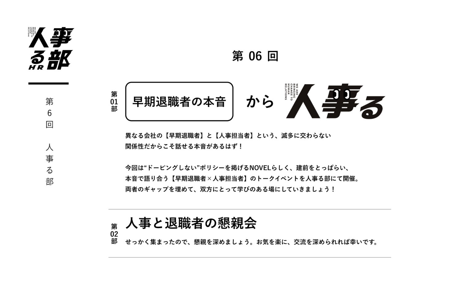 NOVELでは、本気で人事に取り組む人事担当者たちが集い、オフラインで交流する「人事る部」を発足し、粒揃いのプログラムを開催しています。過去には求人広告添削や模擬面接といった、ユニークな企画を実施。決してググっても出てこない、新しい発見があると好評を博しています。