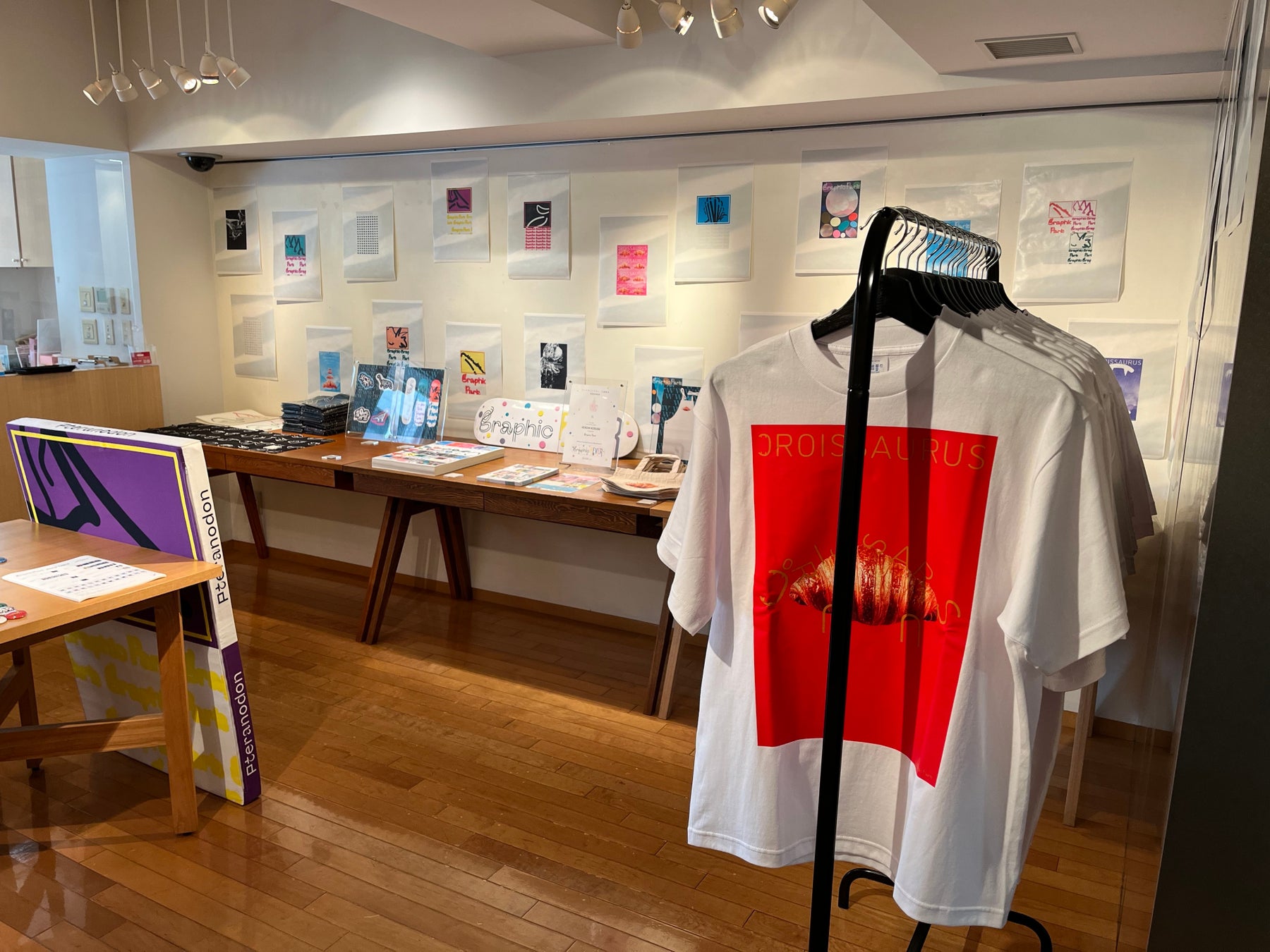 3Fでは、今回の新作のテーマでもあり、小杉さんが幼少期から大好きだという恐竜をモチーフにしたオリジナルデザイングッズを会期およびMMM限定で販売(一部受注販売)しています。gggの1Fで展示中の作品(B1ポスターサイズのクッションや色鮮やかなタイポグラフィカルな恐竜クッション)はもちろんのこと、ストリート感溢れるスケートボードやTシャツ。新作のグラフィックポスターや缶バッジ、ステッカー。小杉さんがデザインを手がけた書籍やFLOWORDなどが所せましと並びます。