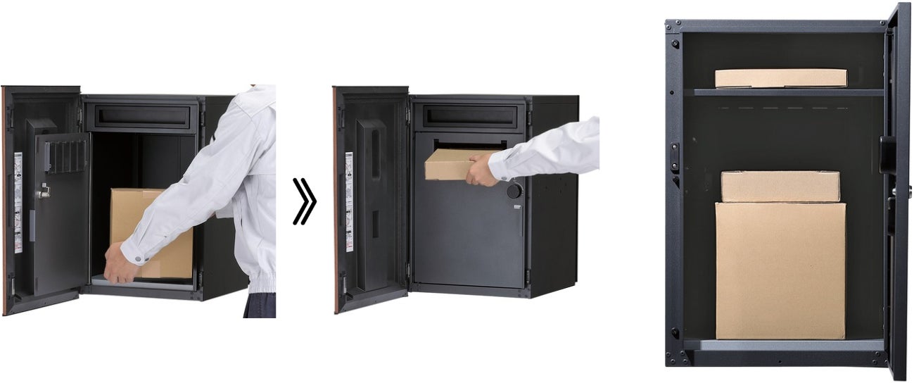 施錠は、宅配物を投入後に、宅配業者が内扉のつまみを回すことで完了します。荷物を取り出し、取出扉を閉めると、自動的に次回の荷物を受け取れる状態になります。