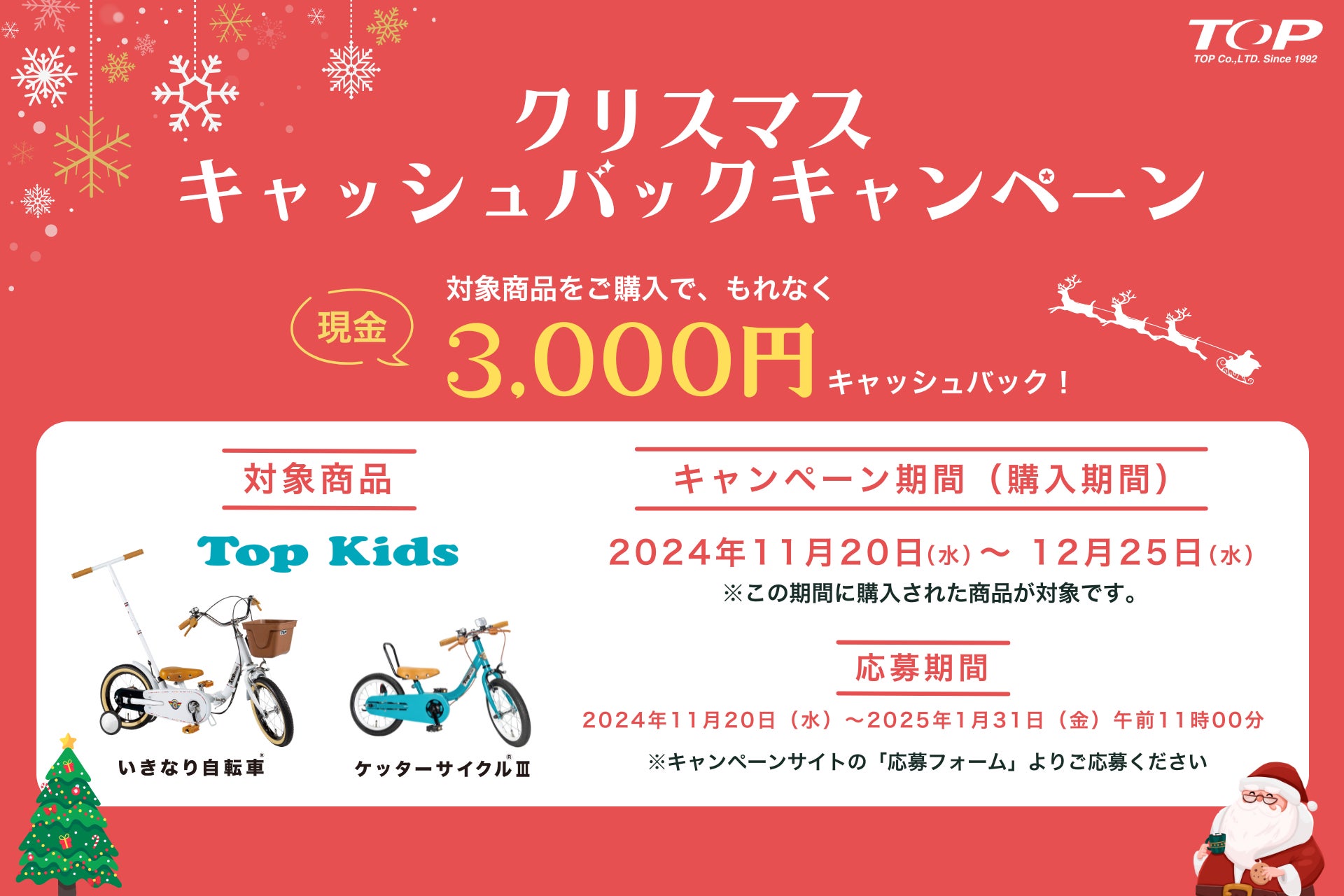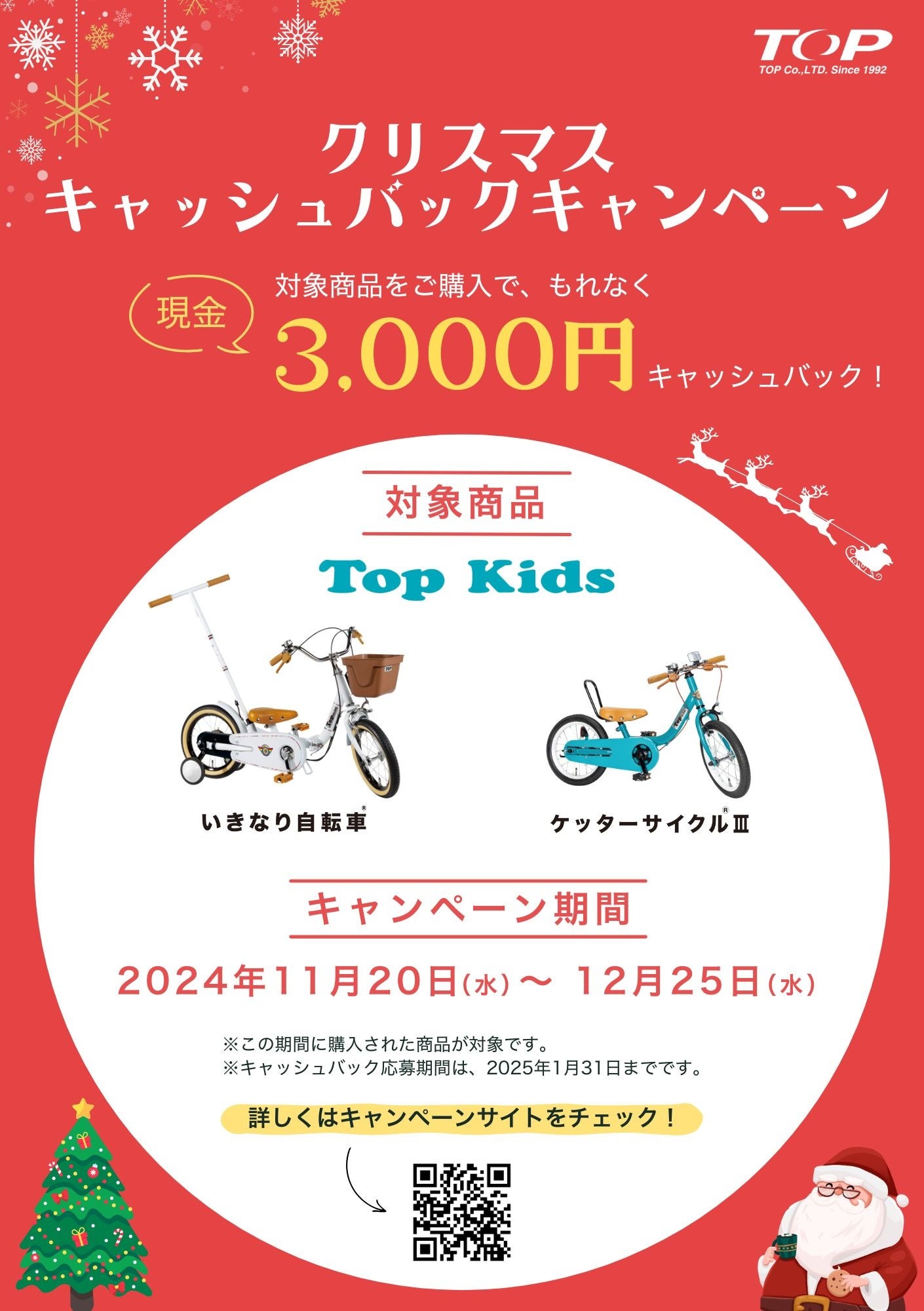 株式会社トップ(本社:東京都新宿区、代表取締役:渡邉晃)は、幼児用自転車ブランド「Top Kids(トップキッズ)」の商品を対象とした「クリスマス キャッシュバックキャンペーン」を2024年11月20日(水)~12月25日(水)に実施いたします。
