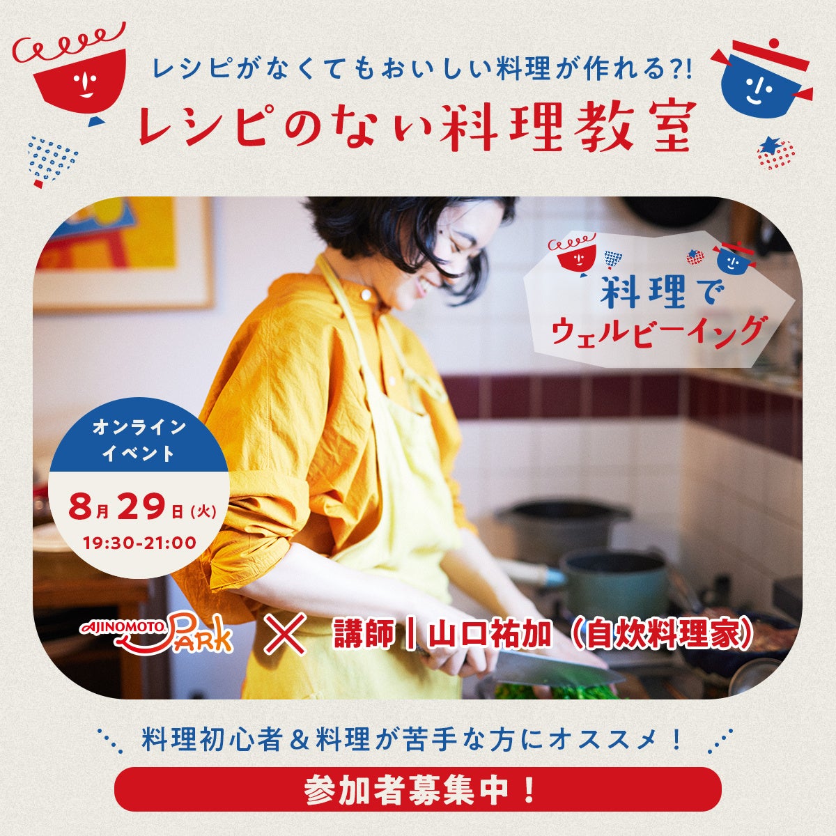 今回の研究結果を受け、本プロジェクトの活動第2弾として、「AJINOTMOTO PARK」公式ファンコミュニティ「味のもト~ク」主催の「レシピのない料理教室」を8月29日(火)にオンラインで開催します。自炊料理家の山口祐加さんを講師にお迎えし、料理初心者や、苦手意識を持っている方に向けて、レシピに縛られることなく、料理を楽しんでいただくために、山口さんと対話形式で一緒に料理をしながら進める参加型オンラインイベントです。野菜をいろんな形に切ってみたり、お肉の下準備や味付けの方法を変えてみたりと、調理によって、食材がおいしい料理に変化する過程を体験していただきます。