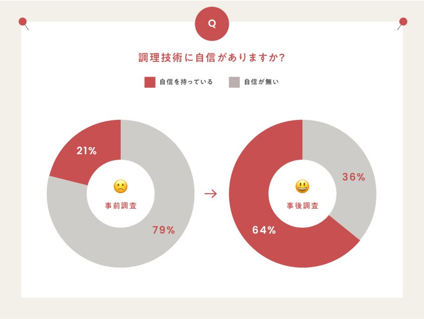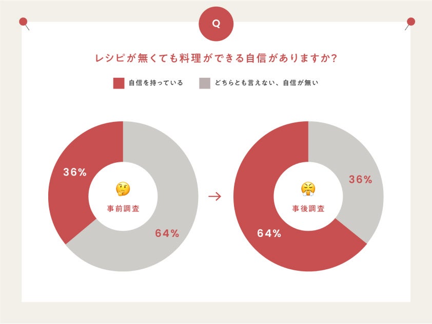 ・参加者の調理に対する技術の向上、心理的ハードルの低下が見られ、レシピを見ないで調理できるようになった学生が36%から64%に