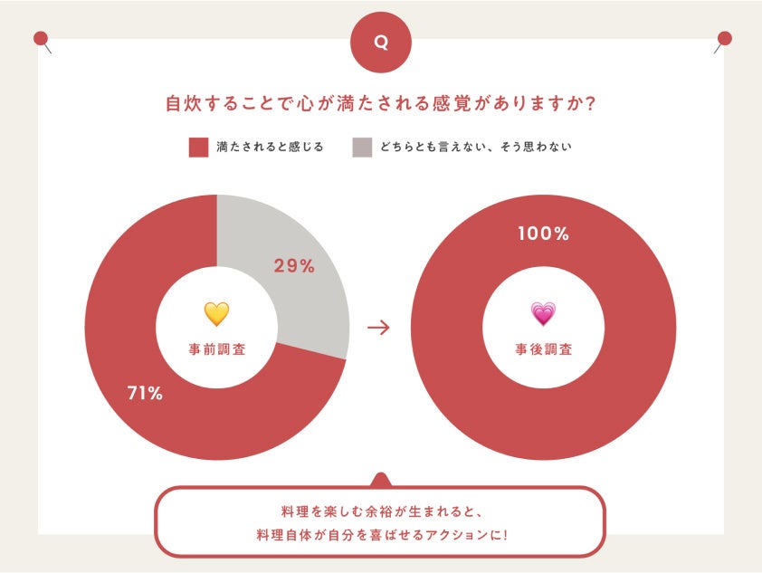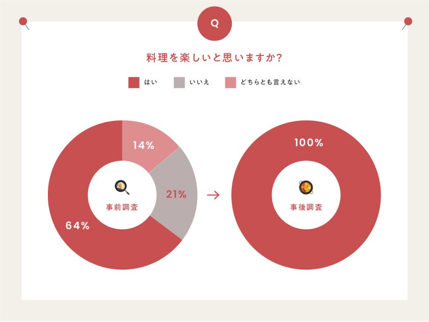 また、料理を楽しいと思う学生は64%から100%の結果になりました。心理的にも料理に対するハードルが低下し、結果的に自炊に取り組みやすいモチベーションへの変化が見られ、参加者からは、「今まで料理は「できるようになっておかないと困るもの」とか、「将来は毎日やるもの」とか、義務のような意識が強かったけれど、本ワークショップを通して、料理は楽しいものだ!という意識に変わった」などの声が上がりました。