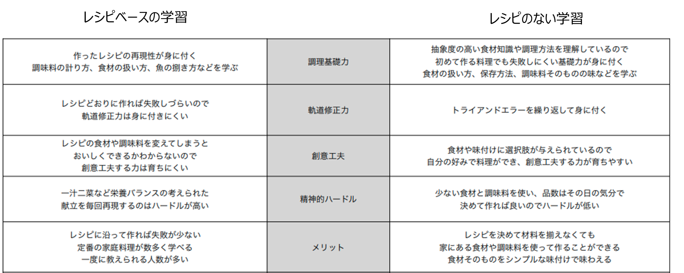 従来、料理の学習法として用いられるレシピベースの学習は再現性が高く、同じ料理を同じ完成度で作ることや、定番料理が多く習得することができるというメリットがあるものの、初心者の場合、そのレシピに頼り切りになり、創意工夫力や、軌道修正力が育ちにくくなる側面があります。一方、レシピを見ずにトライアンドエラーを繰り返し習得する“レシピのない学習”では、特定の料理の再現性やレシピの習得数は多くないものの、基本的な調理技術と応用力が身につきます。