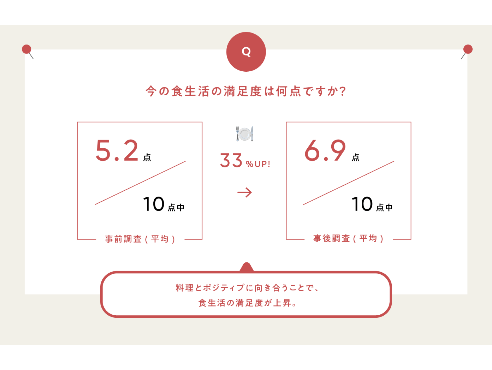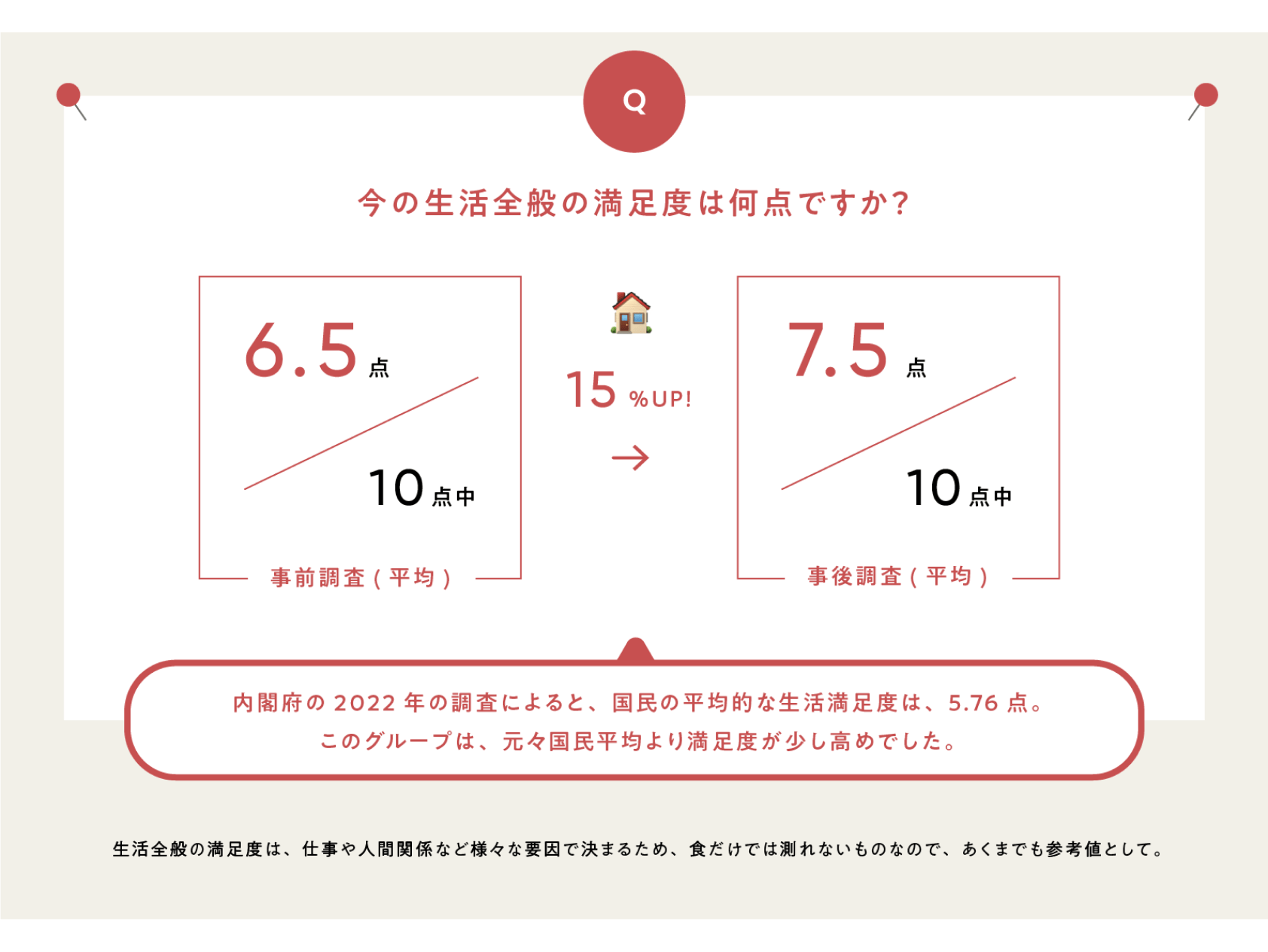 ・食生活の満足度が参加者平均33%増加し、生活全般の満足度も15%増加