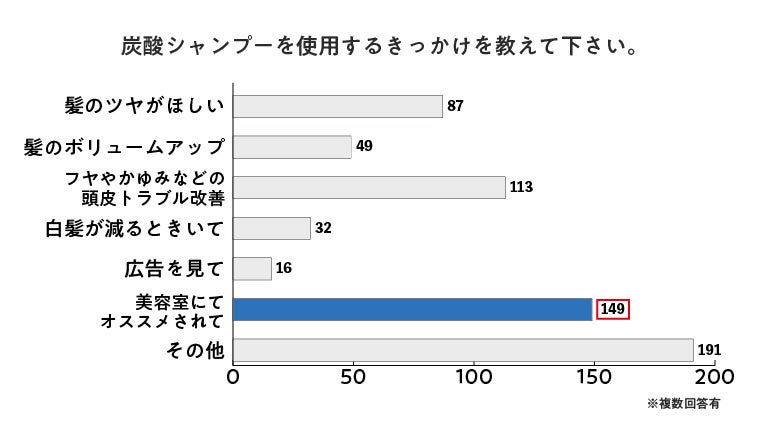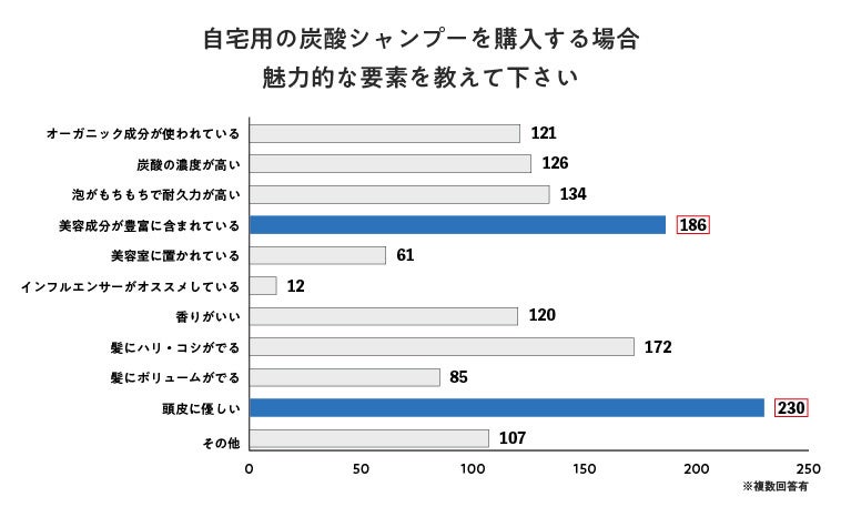 炭酸シャンプーは頭皮へのアプローチするという認知は根付いていることを感じられる結果となりました。しかし全体的に見ると上位の回答は大きな差はなく、ヘアケアや頭皮ケアとして全体的に求めている項目とも言えるかも知れません。