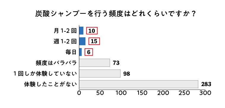 また「炭酸シャンプーを行う頻度はどれくらいですか?」という質問に対しては「行ったことがない」以外を選択した202人の中で定期的に炭酸シャンプーを行うという方は約15%にとどまりました。