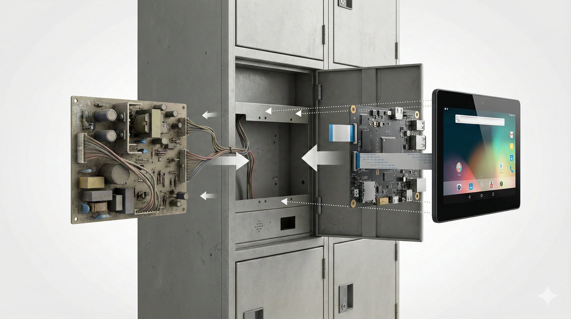 本サービスは、老朽化した宅配ボックスの筐体や主要な機構部はそのまま活用し、制御基板や操作パネル(Android搭載タッチパネル等)といった制御部のみを最新システムへ入れ替えることで、従来は筐体ごとの全撤去・全交換が必要だった設備を、低コストかつ短工期でIoT化・クラウド管理化するソリューションです。
